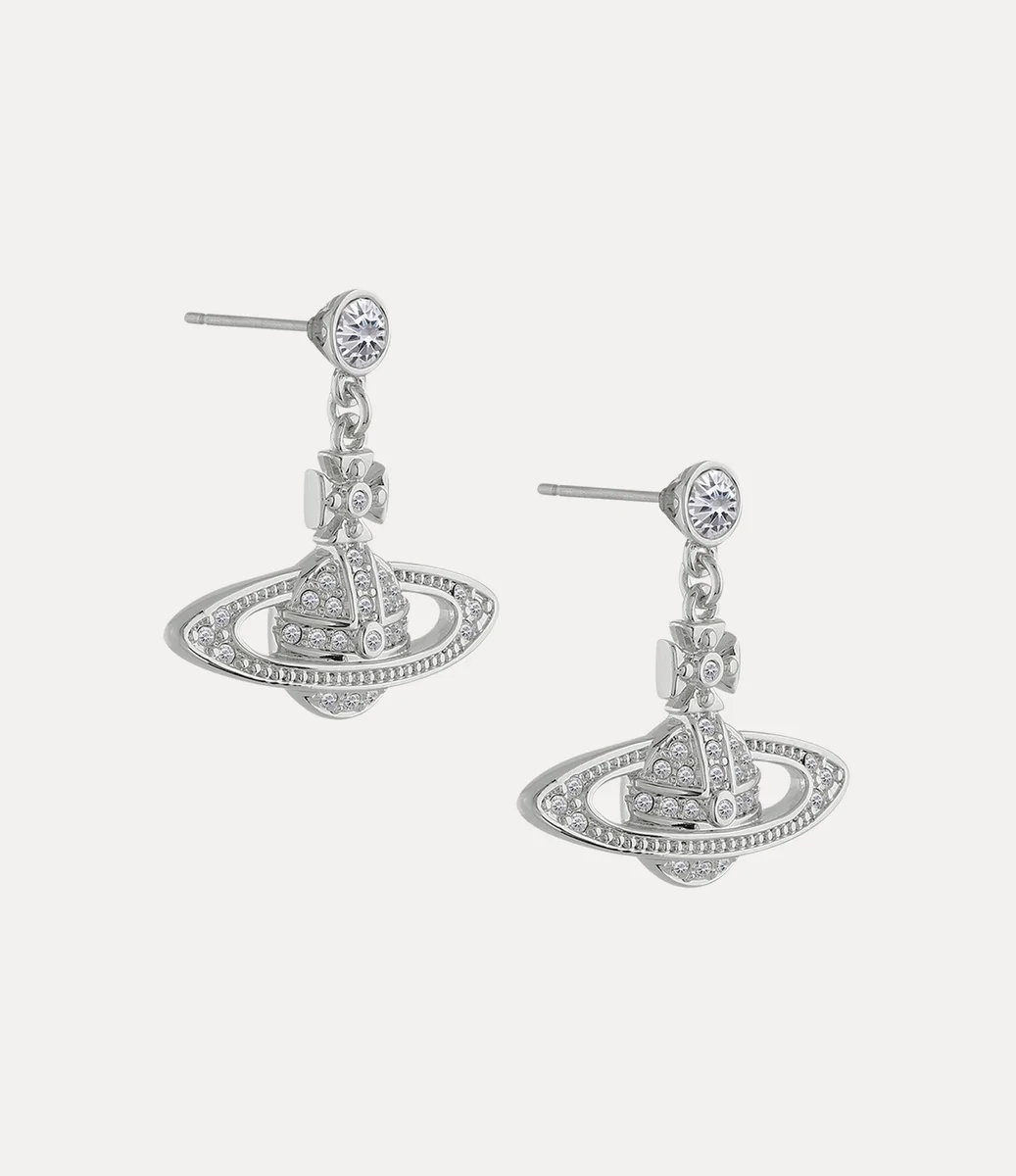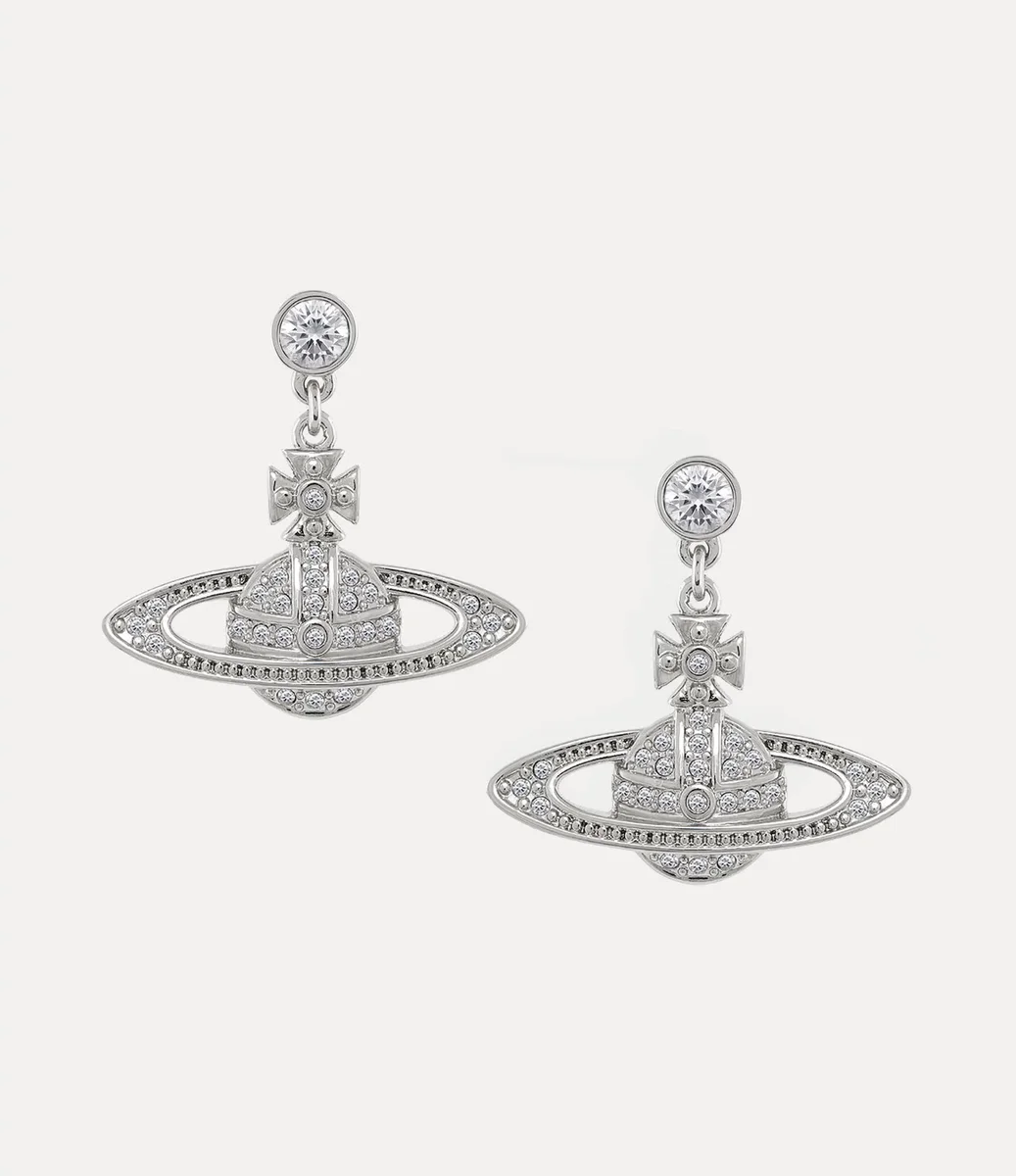 Den sfäriska silhuetten har länge varit synonym med modehuset och påminner om Viviennes vision om att föra traditionen in i framtiden. Mini Bas Relief Drop-örhängena har en sfärisk silhuett, komplett med polerad silverplätering och tonade kristalldetaljer som finish.