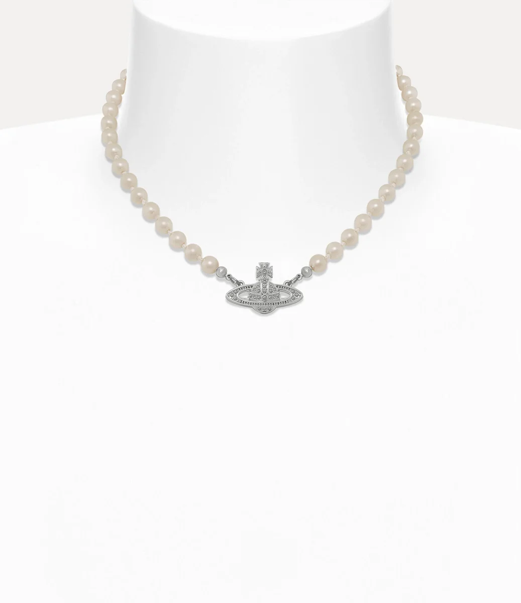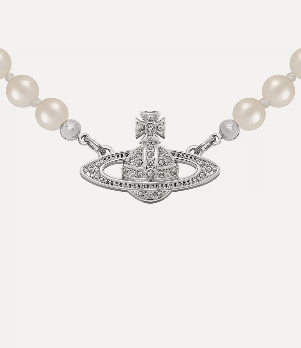 I slutet av 1980-talet introducerade Vivienne Westwood sitt ikoniska pärlkoncept på Harris Tweed Fall 1987-modevisningen, med ett enkelsträngat halsband. Vårt Mini Bas Relief Pearl-halsband är inspirerat av denna ursprungliga design och har omskapats med det klassiska globmotivet i mitten, förstärkt av glittrande kristaller – vilket påminner om husets etos att länka samman det förflutna med framtiden.
