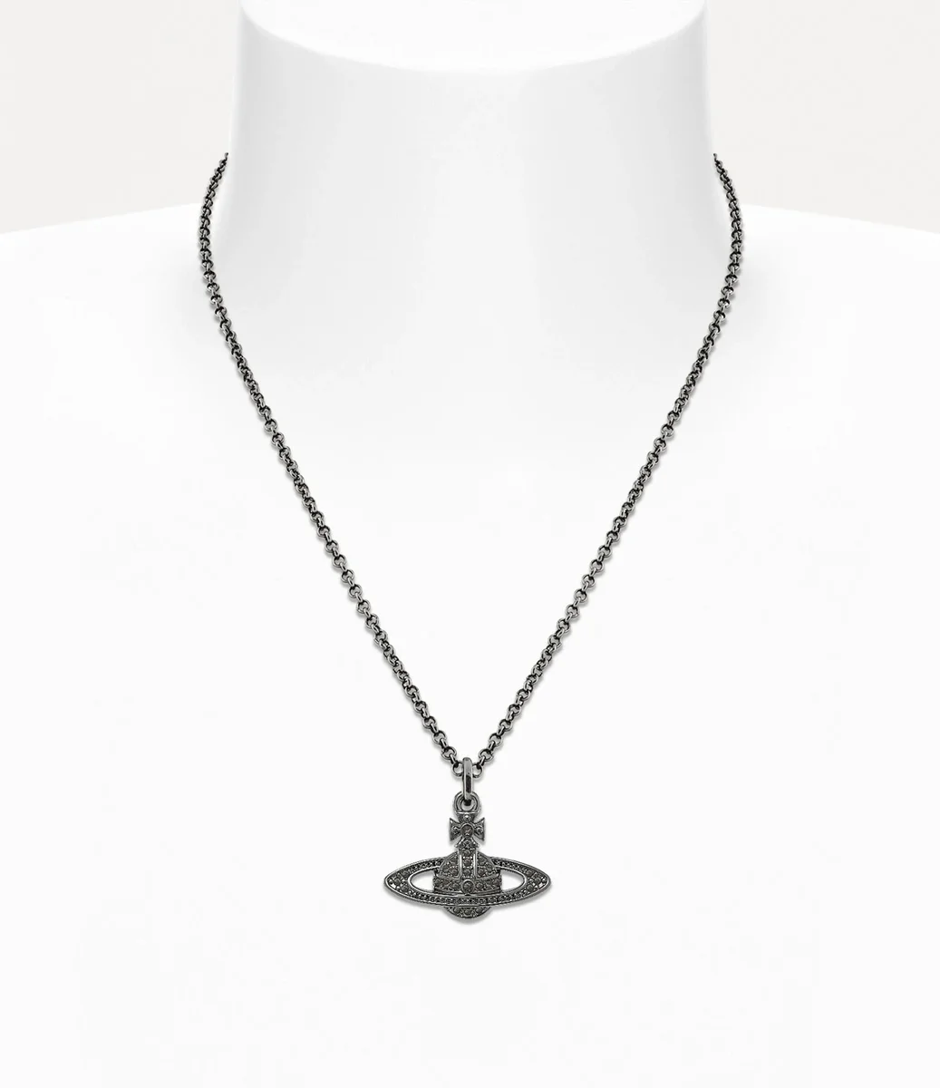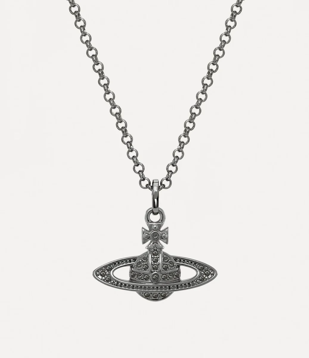 Kulan är ett viktigt element i husets ikonografi och påminner om Viviennes vision om att föra traditionen in i framtiden. Vårt Mini Bas Relief Pendant-halsband har en kristallbelagd kula i mitten av designen, kompletterad med en graverad tagg vid det klassiska karbinhakslänket.