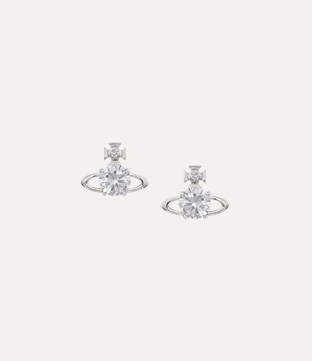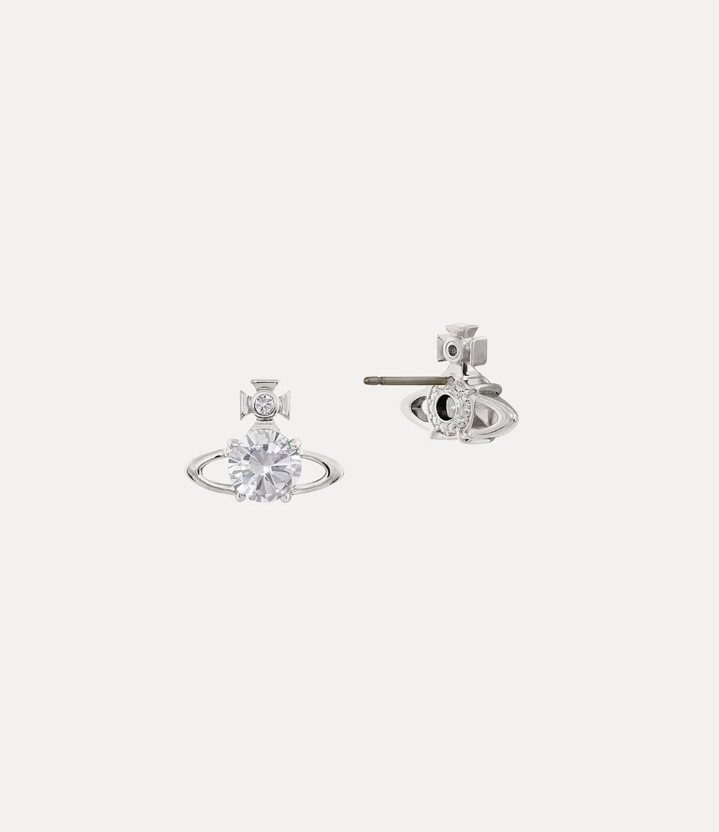 De silverfärgade Reina-örhängena har en sfärisk silhuett som förkroppsligar Viviennes vision om att blanda tradition med framtiden. De är prydda med glittrande vitfärgade kristaller i korsets topp och mitt och har en delikat design med stiftfäste.