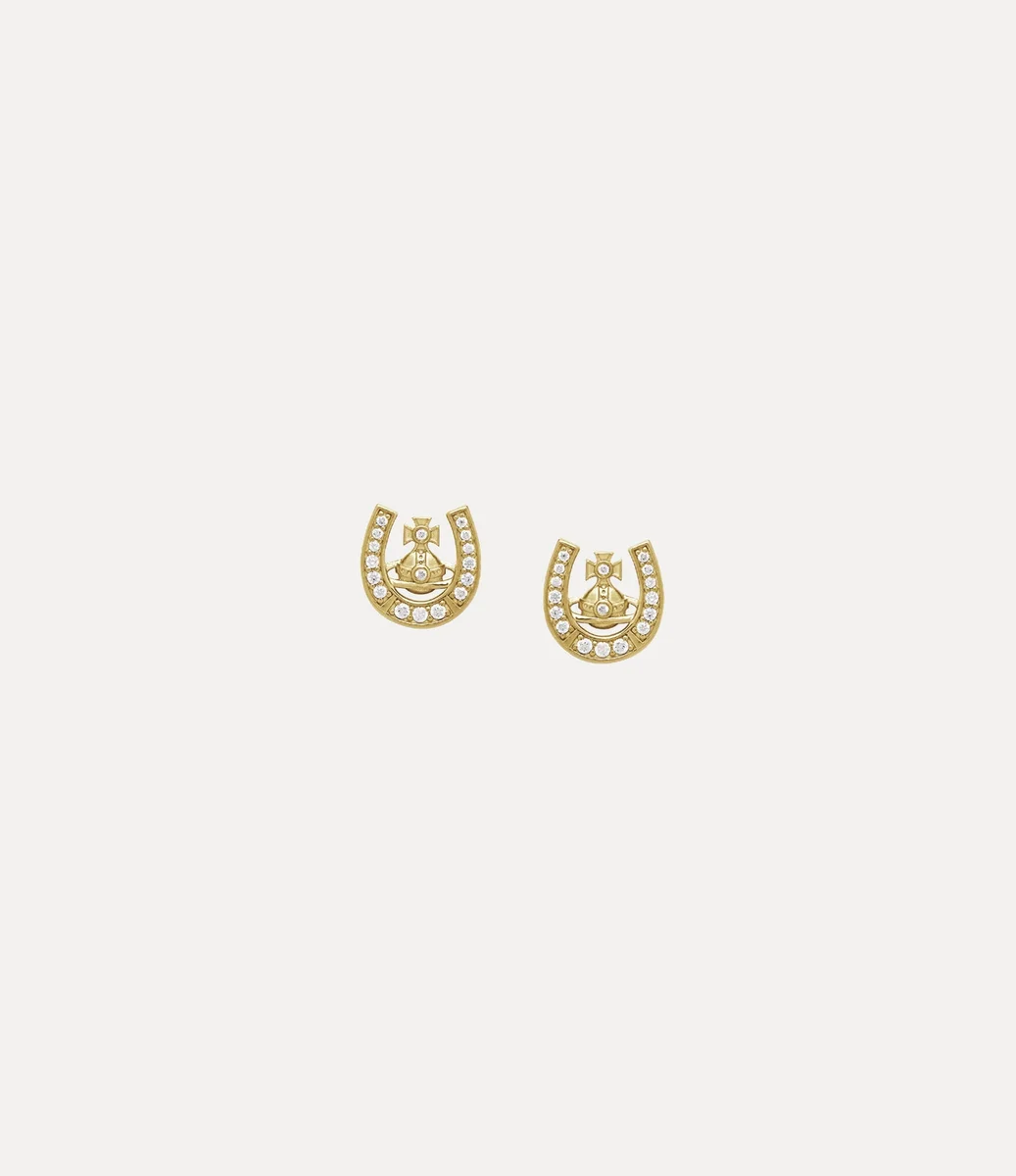 Våra Mare-örhängen är en ny tolkning av husets signaturikonografi, med en guldfärgad kula omgiven av ett centralt hästskomotiv, en symbol för lycka och skydd. Smycket är prydd med tonade kristaller för en subtil glans och avslutas med vår klassiska kulformade fjärilsfäste.