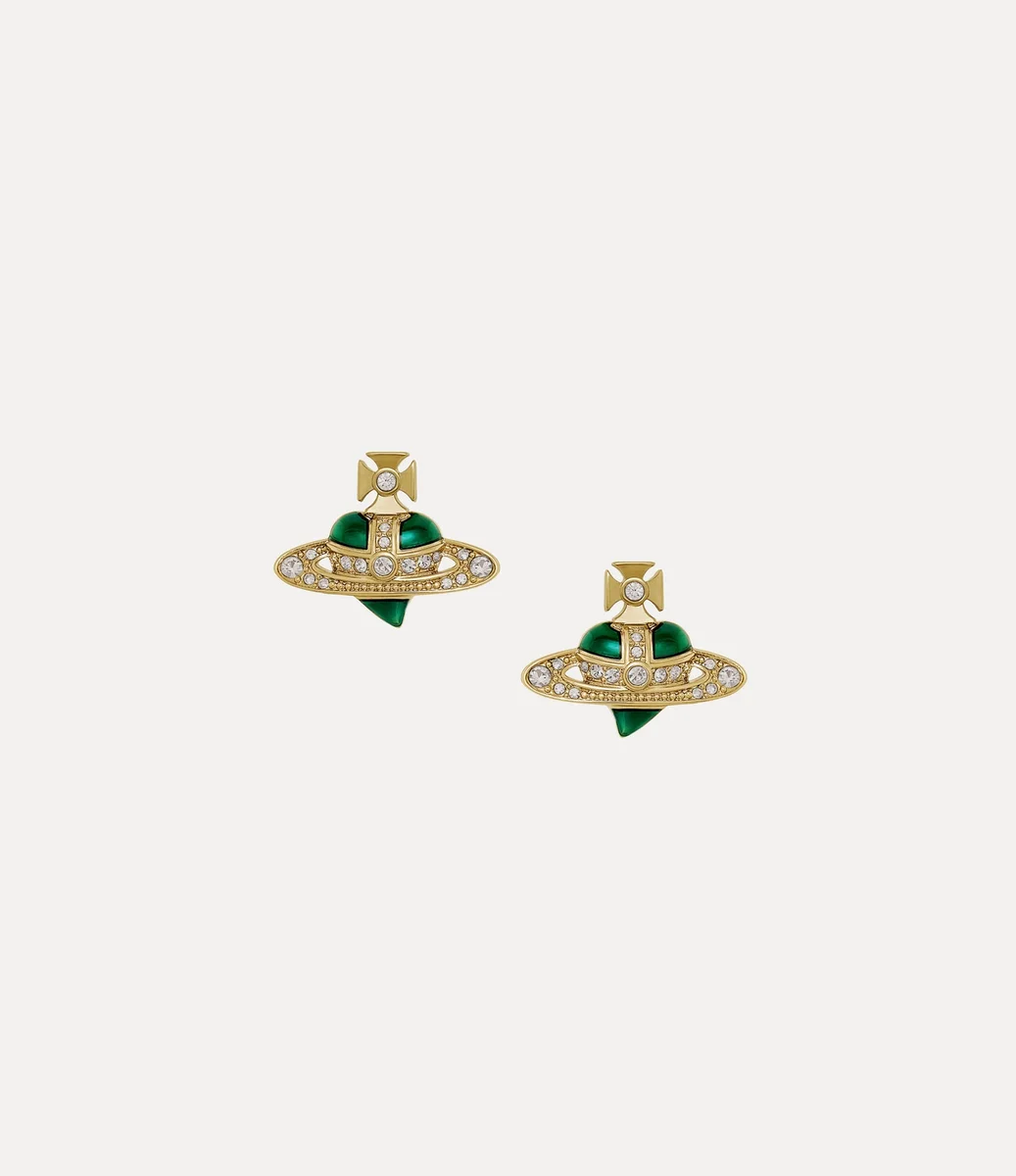 De nya Diamante Heart-örhängena återupplivar husets signaturmönster med asymmetriska hjärtan, som Vivienne använde för att väcka kärlek till både mänskligheten och planeten. Designen är täckt med glittrande pavékristaller och avslutas med grönt handmålat emalj, i kombination med våra signaturfästen med sfärisk fjärilsrygg.