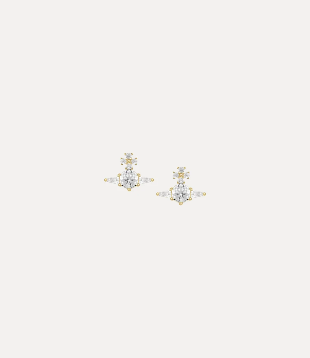 Våra Ofelia örhängen har en guldtonad sfärisk silhuett, inspirerad av vårt hus signaturmotiv i form av en sfär. Designen är täckt med glittrande runda och avsmalnande kubiska zirkonia-baguettekristaller och speglar Viviennes vision om att ta traditionen in i framtiden.
