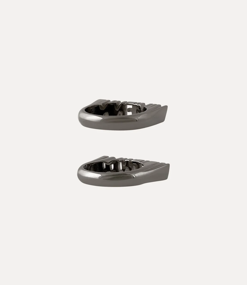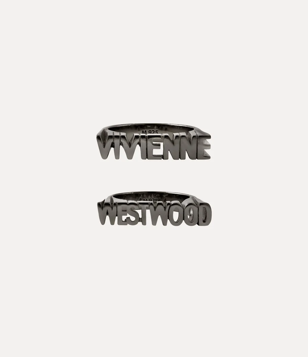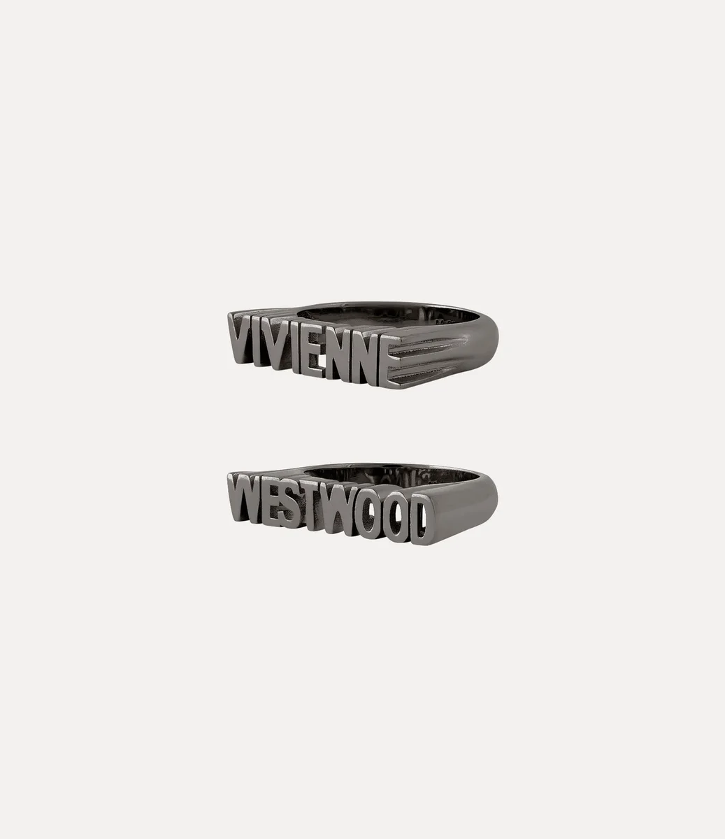 Vår Essex-ring är tillverkad av återvunnet silver och har en polerad plätering i gunmetal-ton. Den har två djärva metallband, det ena med texten ”Vivienne” och det andra med ”Westwood”, och designen accentueras av intrikata utskurna detaljer som följer konturerna av varje bokstav.