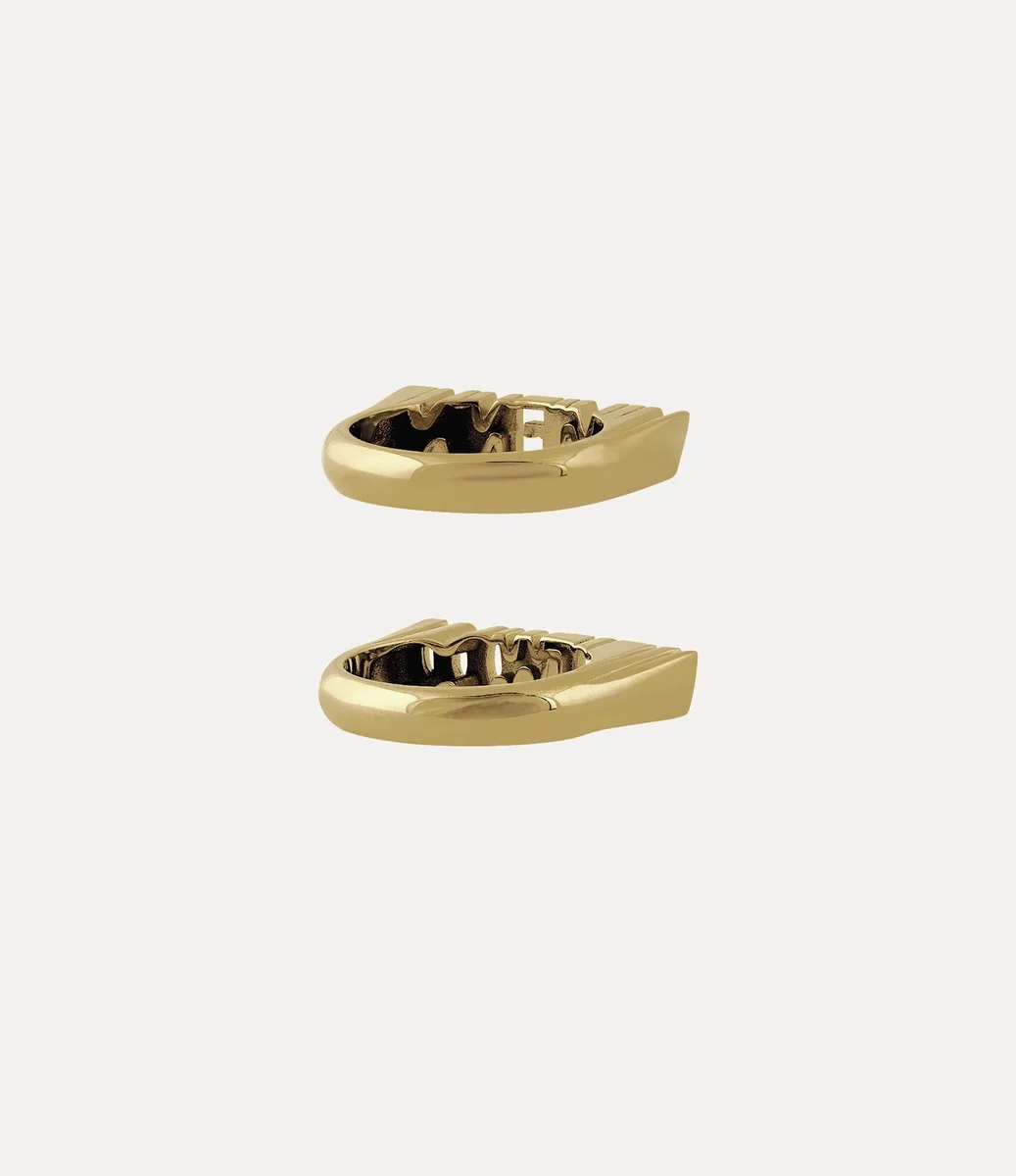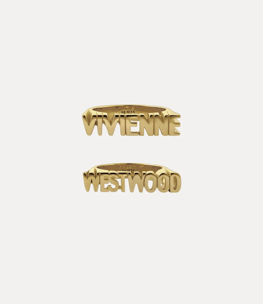 Vår Essex-ring är tillverkad av återvunnet silver och har en polerad guldplätering. Den har två djärva metallband, det ena med texten ”Vivienne” och det andra med ”Westwood”, och designen accentueras av intrikata utskurna detaljer som följer konturerna av varje bokstav.