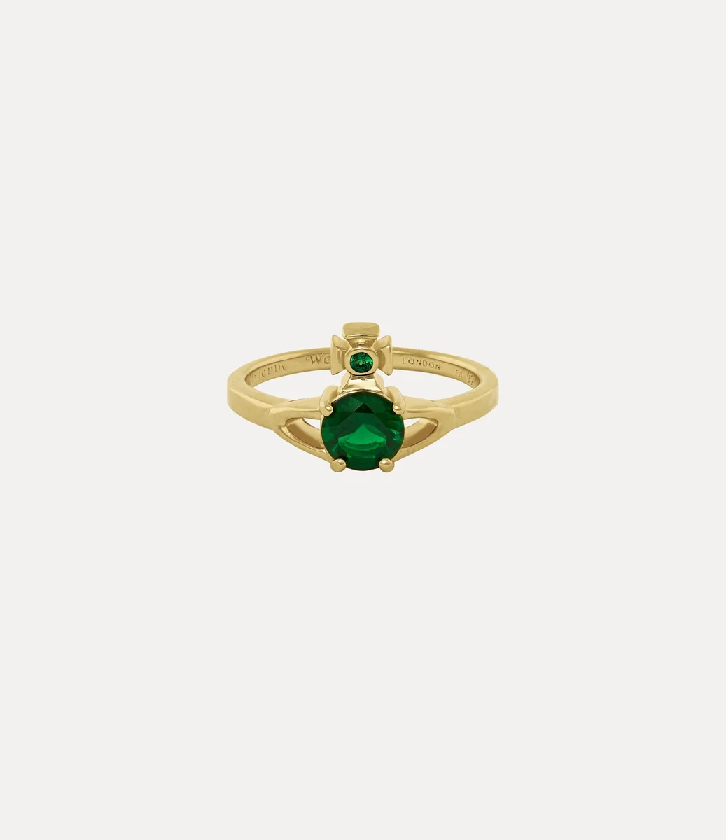 Vår Reina Petite-ring finns i återvunnet silver, med en glittrande guldtonad yta och gröna kristallutsmyckningar. Produkten har en sfärisk yta som representerar tradition, omgiven av Saturnus himmelska ringar som symboliserar framtiden.