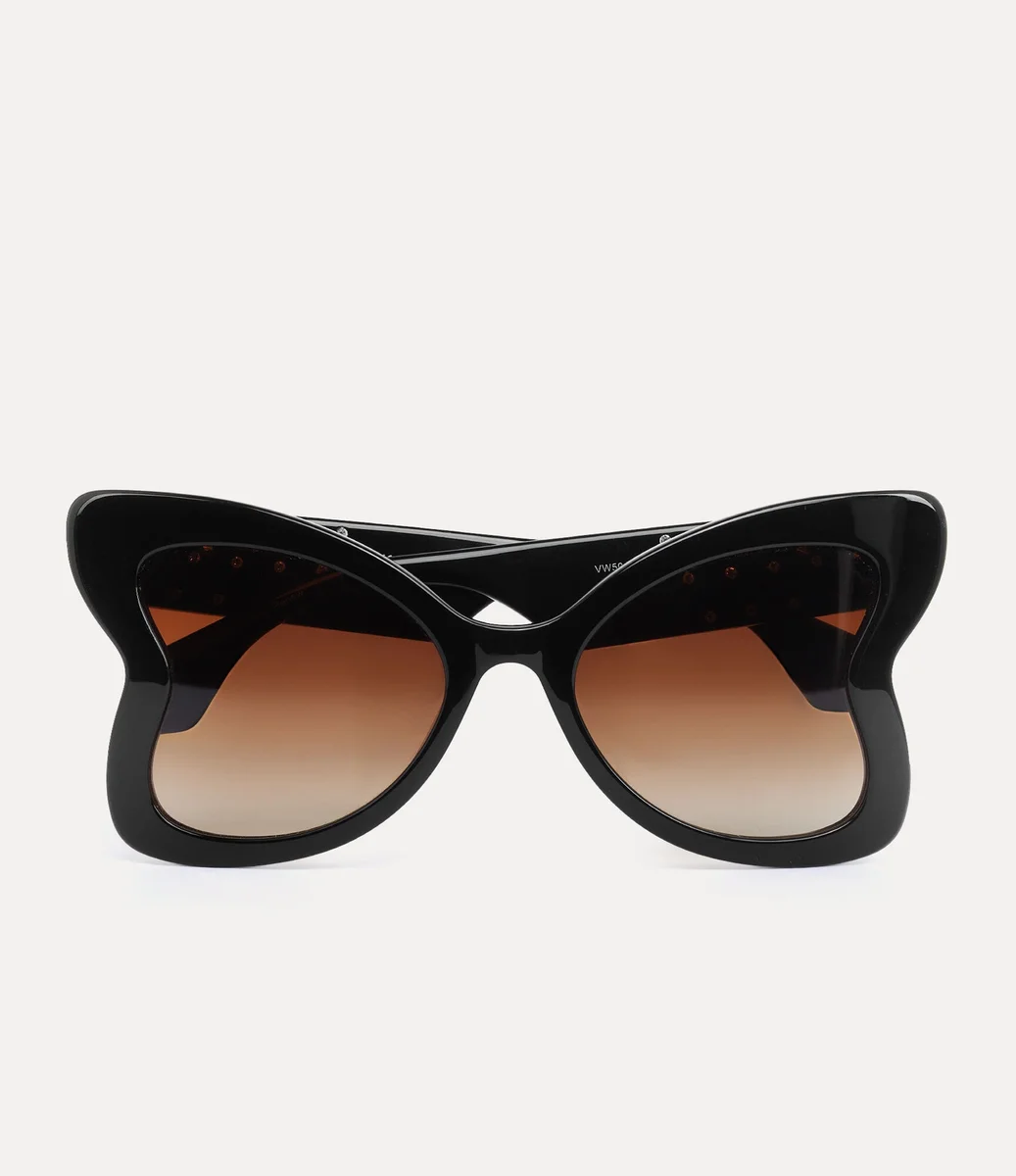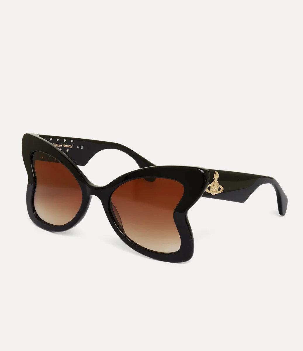 Våra handgjorda Athalia-solglasögon med en överdimensionerad, fjärilsinspirerad båge har kristallprydda insidor och graderade linser. Inspirerade av skönheten i georgianska smyckesmedaljonger är skalmarna försedda med en guldfärgad kula.