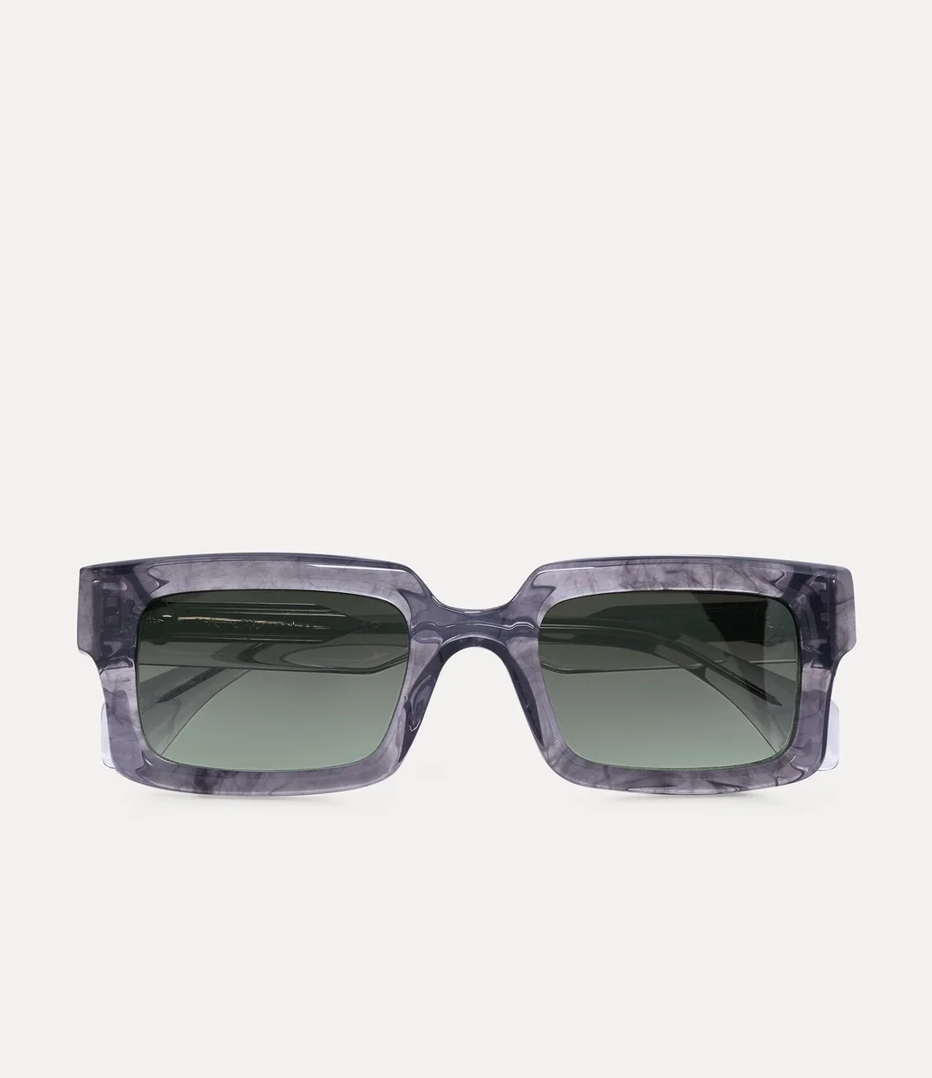 Costello-solglasögonen kännetecknas av en djärv och tidlös estetik, inspirerad av legendariska kulturpersonligheter från scen och film. Designen har fyrkantiga bågar med graderade linser och är tillverkad i grå marmorimiterad acetat, prydd med polerade hornaccenter på ytterkanten – en hyllning till Viviennes ikoniska Horn Alice-band.