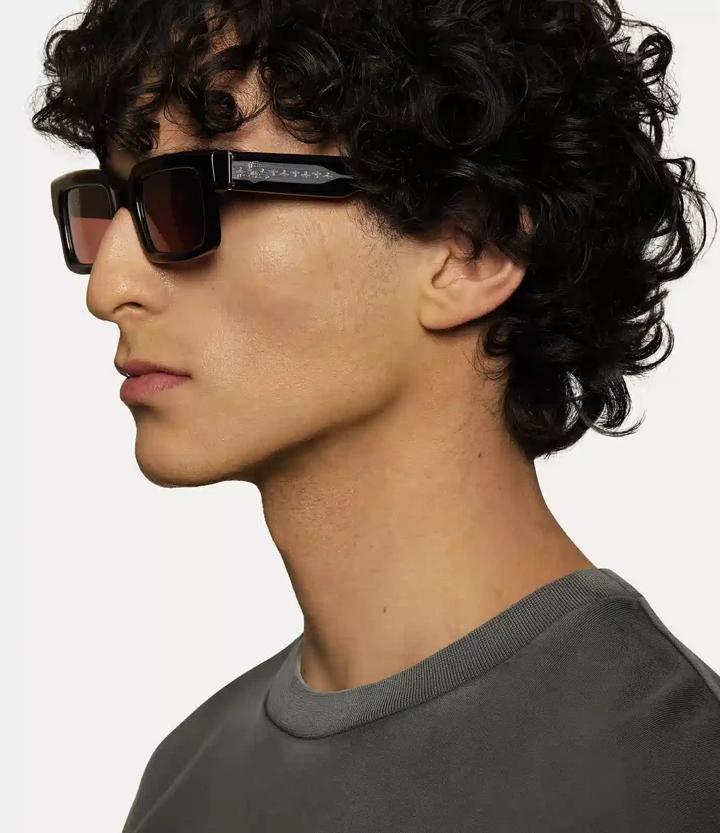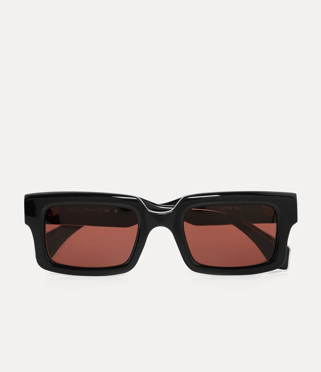Silhuetten på de glänsande svarta Costello-solglasögonen är inspirerad av ikoniska kulturpersonligheter från scen och film. Den distinkta designen med tjocka fyrkantiga bågar och bruna tonade glas förstärks av intrikata hornaccenter som pryder ytterkanten – en hänvisning till Viviennes ikoniska Horn Alice-band. De skulpterade skalmarna är utsmyckade med globmotiv vid tinningarna, medan de specialdesignade metalldetaljerna är försedda med miniatyrgraveringar av globar.