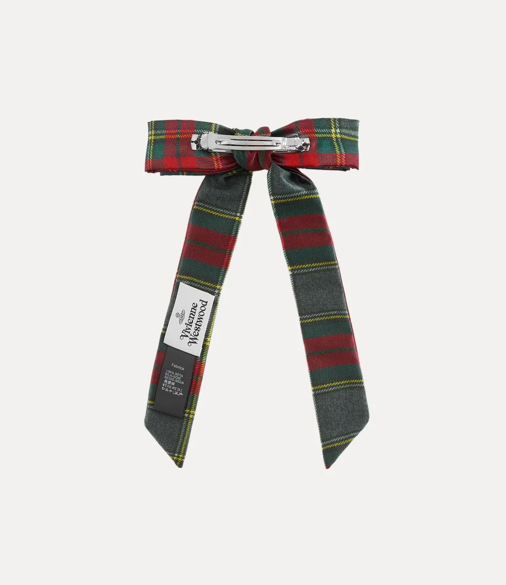 Hårspännet Flyes har en överdimensionerad rosettformad silhuett, prydd med tartanmönstret ”Scarlet”. Den lagerade rosettdesignen är handgjord med klassisk orb-broderi i flerfärgat tråd, vilket återspeglar husets etos att länka samman det förflutna med framtiden.