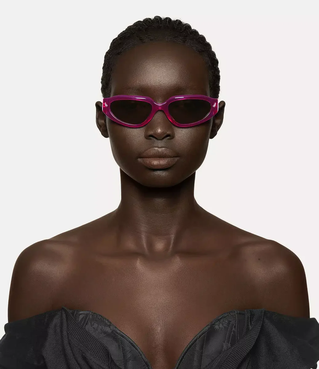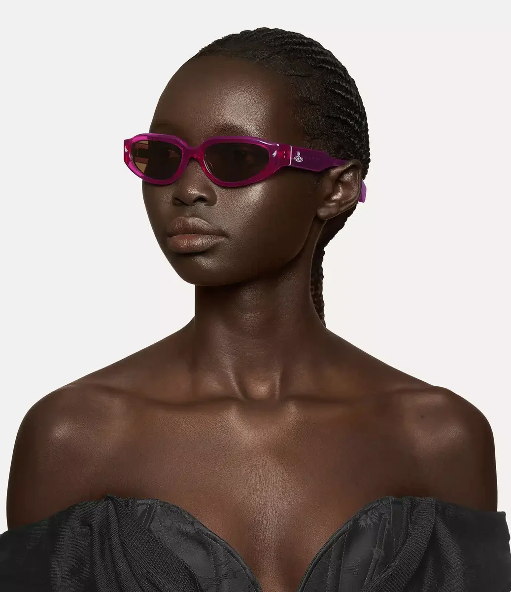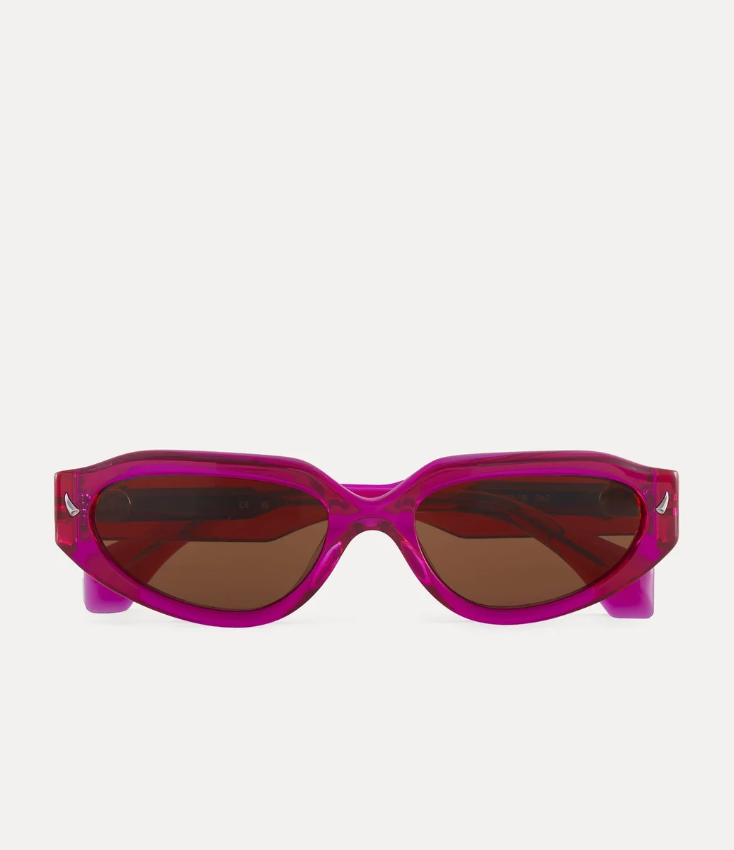 Grace-solglasögonen har en vintageinspirerad oval silhuett med mjukt utsvängda kanter som förmedlar glamouren från Studio 54. De är tillverkade i halvtransparent rosa acetat med bruna linser och accentueras av hornformade dekorationer som påminner om Viviennes ikoniska Horn Alice-band.