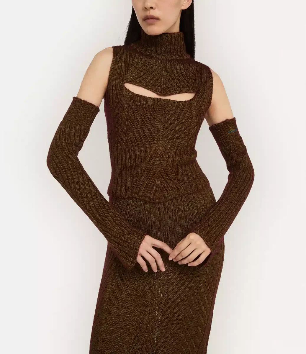 Våra Mary armvärmare är tillverkade av en blandning av silke och mohair och har en unik mix av fiskbens- och ribbstickning. Designen har utsvängda muddar, som formas naturligt av stickstrukturen, och ribbade detaljer längs hela silhuetten.