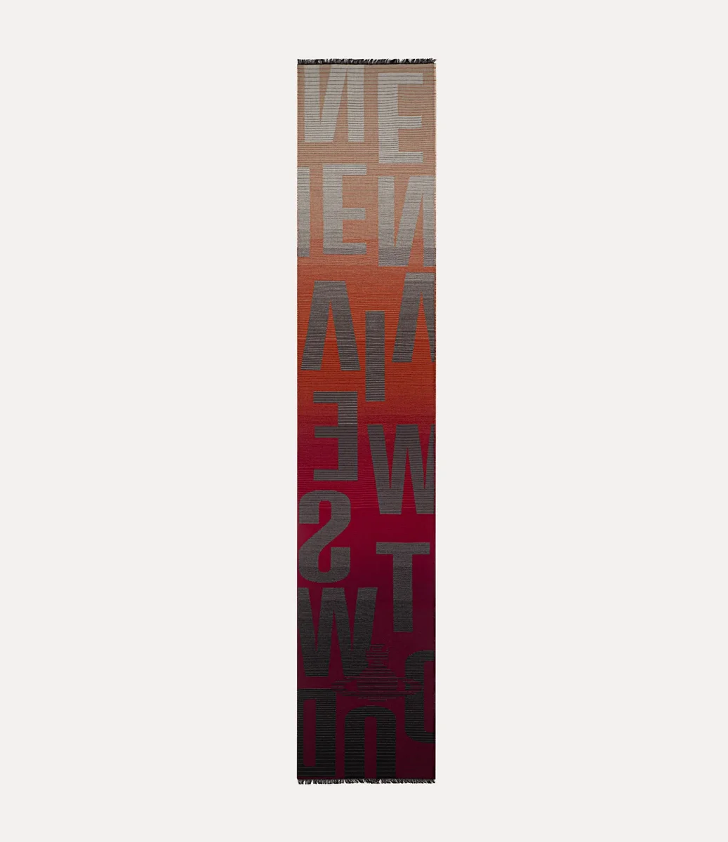 Vivienne Westwood-sjalen har säsongens djärva ”Logomania”-jacquard, vävd i mjuka toner. Med lätta fransar längs kanterna speglar plagget Viviennes vision om att föra det förflutna in i framtiden.