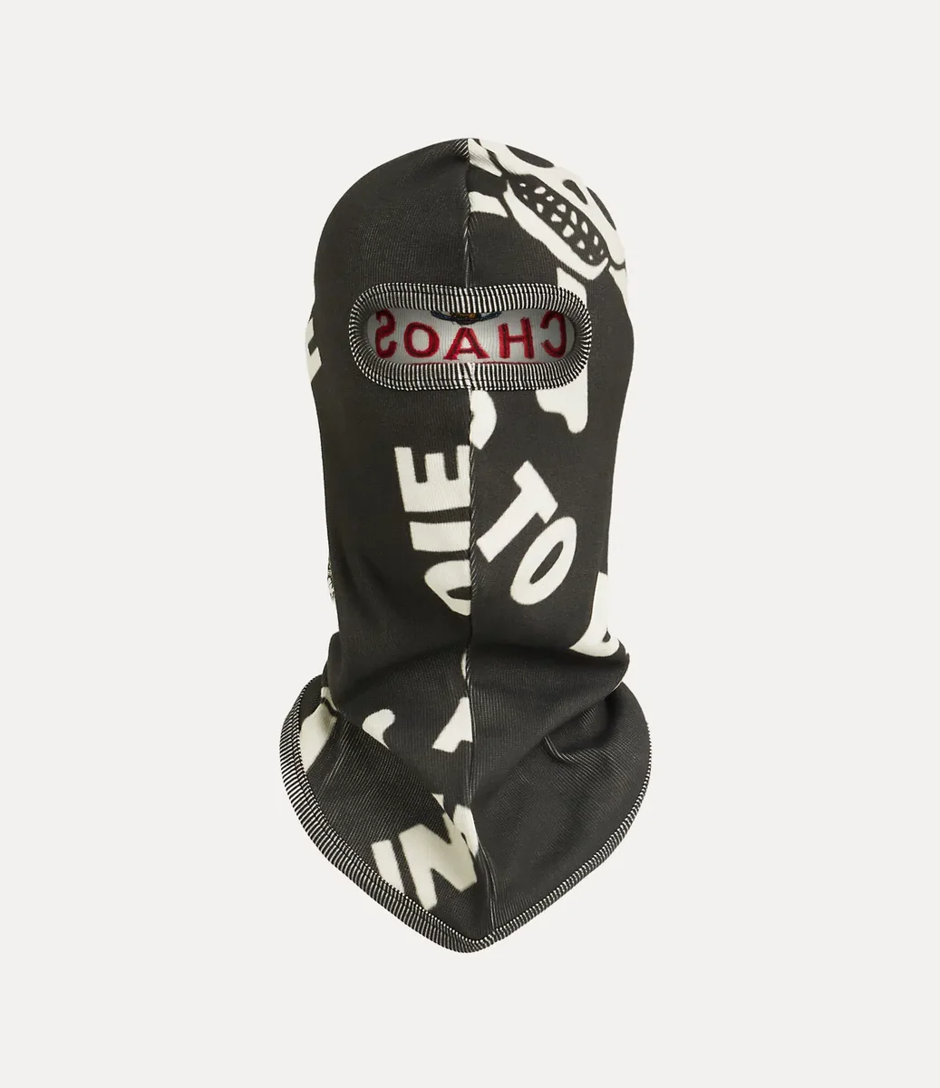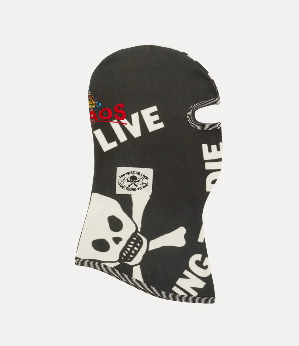 Vår Worlds End Storm-mask är tillverkad av ett mjukt, stretchigt stickat tyg för en bekväm passform och har en skulpterad silhuett som täcker hela huvudet och nacken. Modellen har en djärv, monokrom grafisk design med dödskallar och korslagda ben som vävts in i hela mönstret, vilket påminner om Viviennes signaturestetik inom punk.