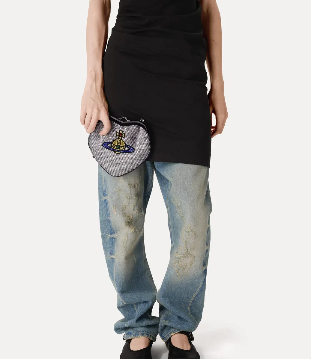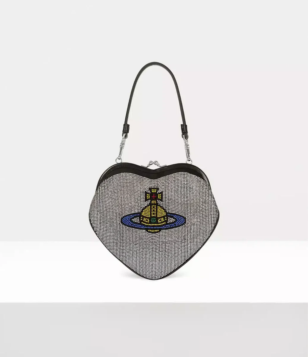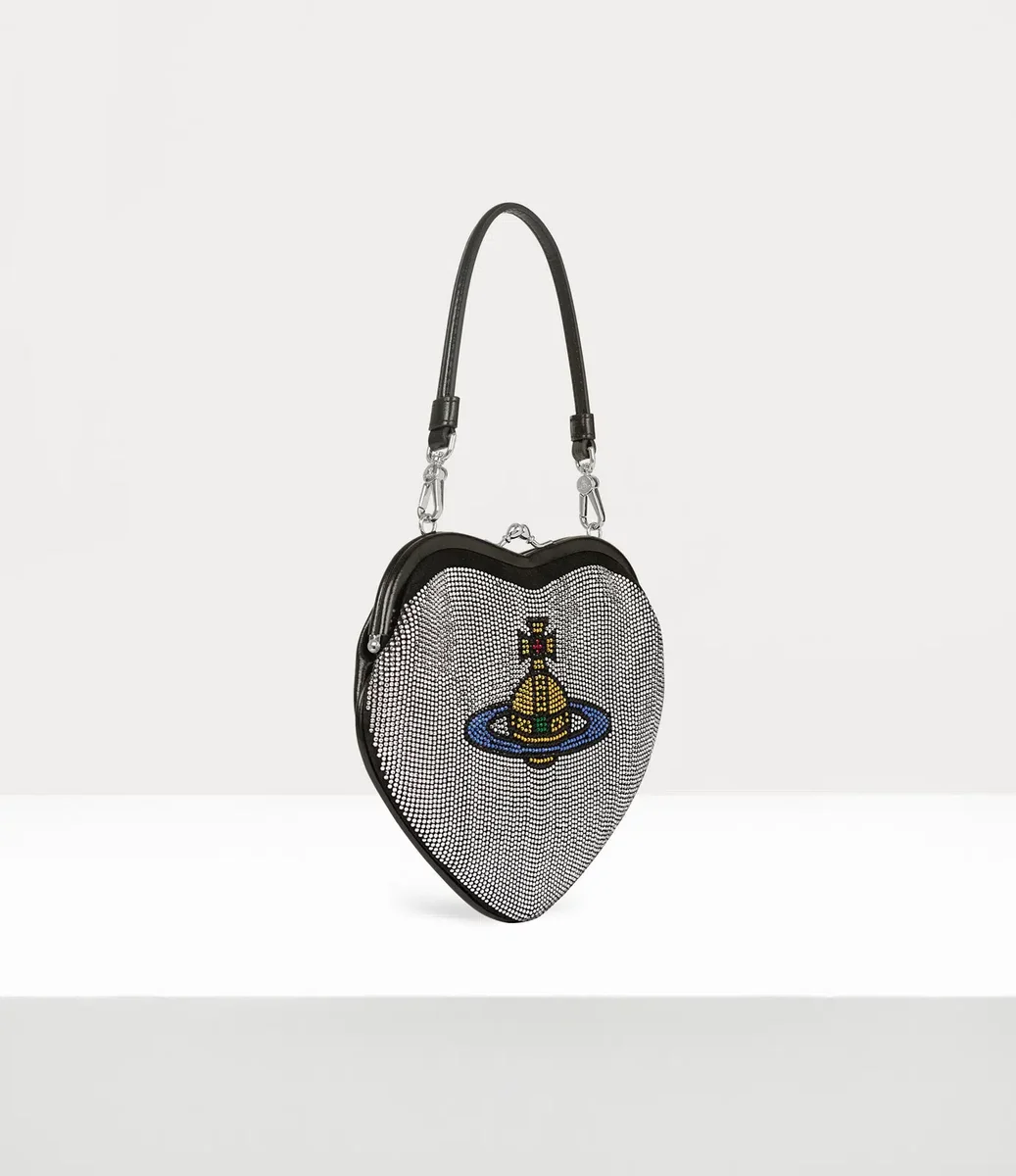 Belle Heart Frame-handväskan har en hjärtformad silhuett, en hyllning till Viviennes kärlek till mänskligheten och planeten, komplett med polerade läderkanter och våra signaturdetaljer i silverton. Designen är utsmyckad med rader av glittrande diamanté-stenar och fångar den lyxiga känslan hos grand hotellets interiör.