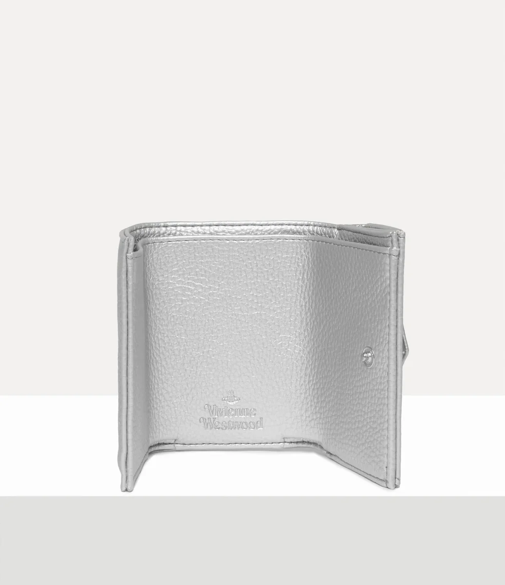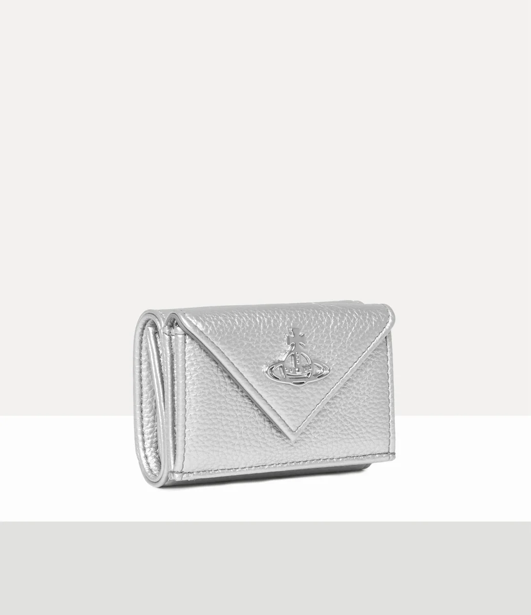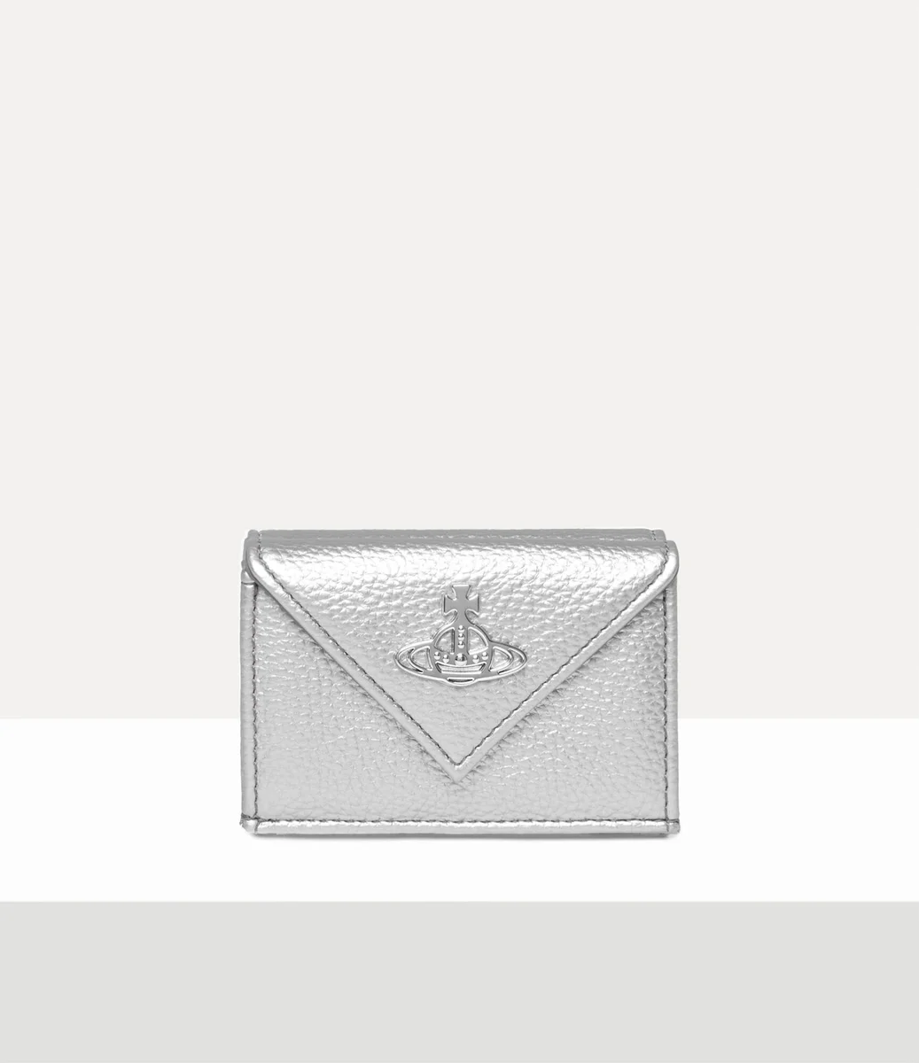 Vår Envelope-plånbok har en silversilhuett i PU, präglad med säsongens korniga finish. Designen har husets signaturmotiv ”Line Orb” i metall på tryckknappsfästet, vilket förkroppsligar Viviennes vision om att föra traditionen in i framtiden.