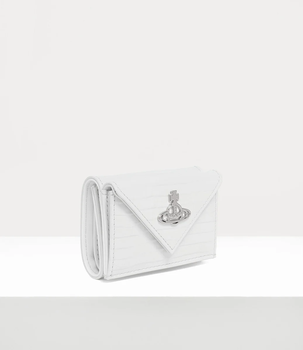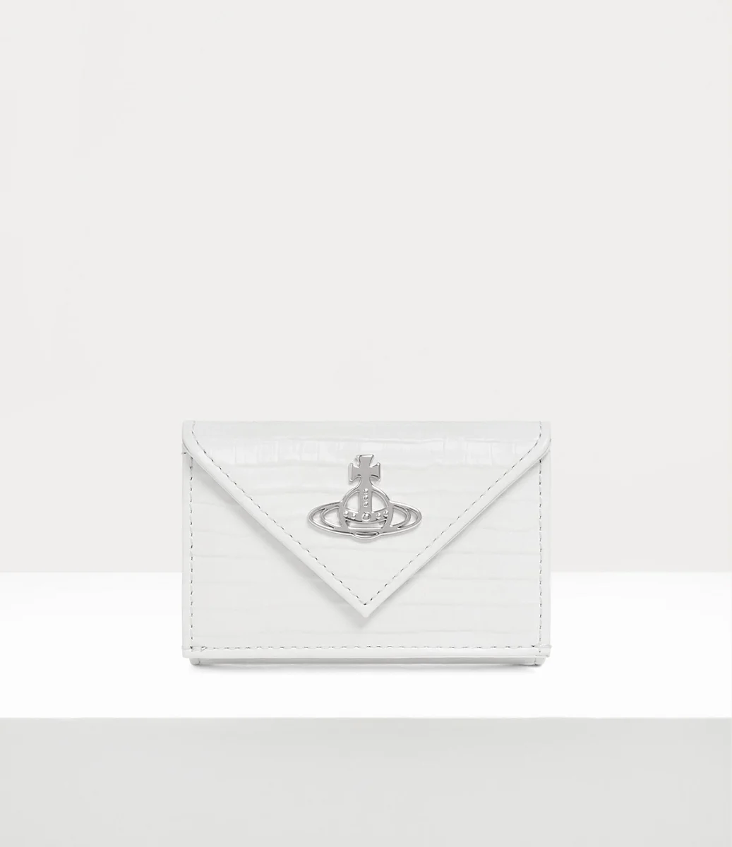Vår Envelope-plånbok har fått en ny design i säsongens mini-krokodileffektpräglade läder. Plånboken är försedd med husets signaturmotiv ”Line Orb” i metall på tryckknappsfästet och förkroppsligar Viviennes vision om att föra traditionen in i framtiden.