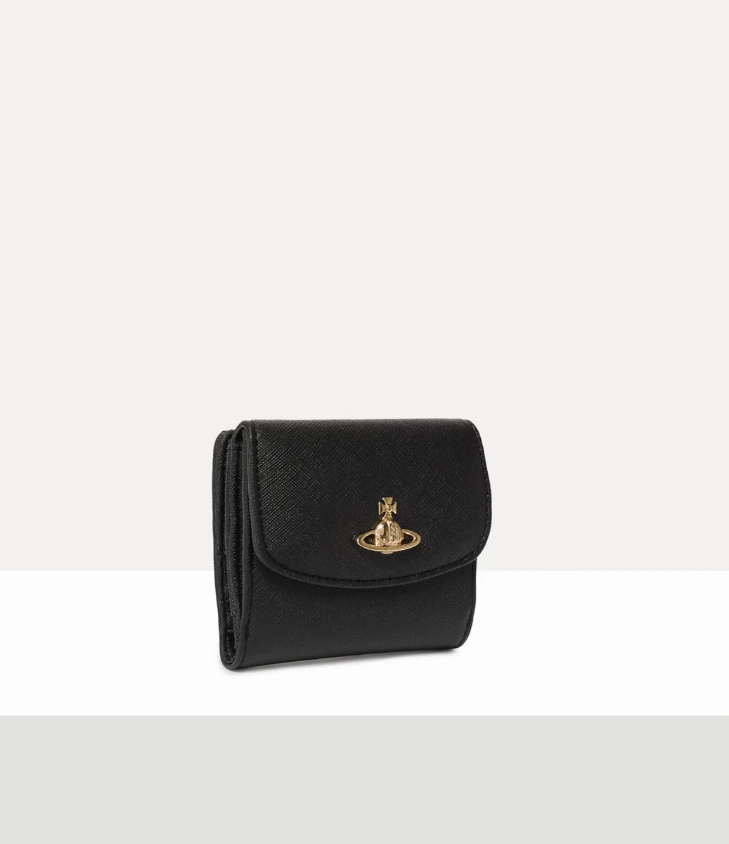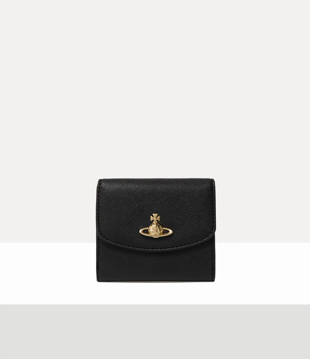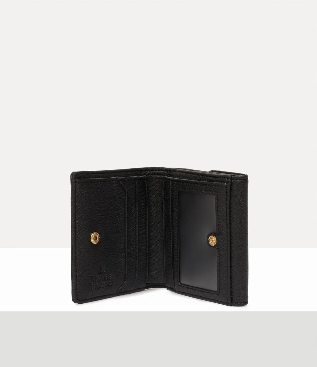 Vår lilla plånbok har en elegant design med dubbla veck, är tillverkad av PU-läder och utmärks av sin korsrutiga saffianostruktur. Husets ikoniska orb-logotyp i guldfärgad metall pryder den främre fliken, ovanför ett polerat tryckknappsfäste, medan subtila präglade märken berikar insidan.