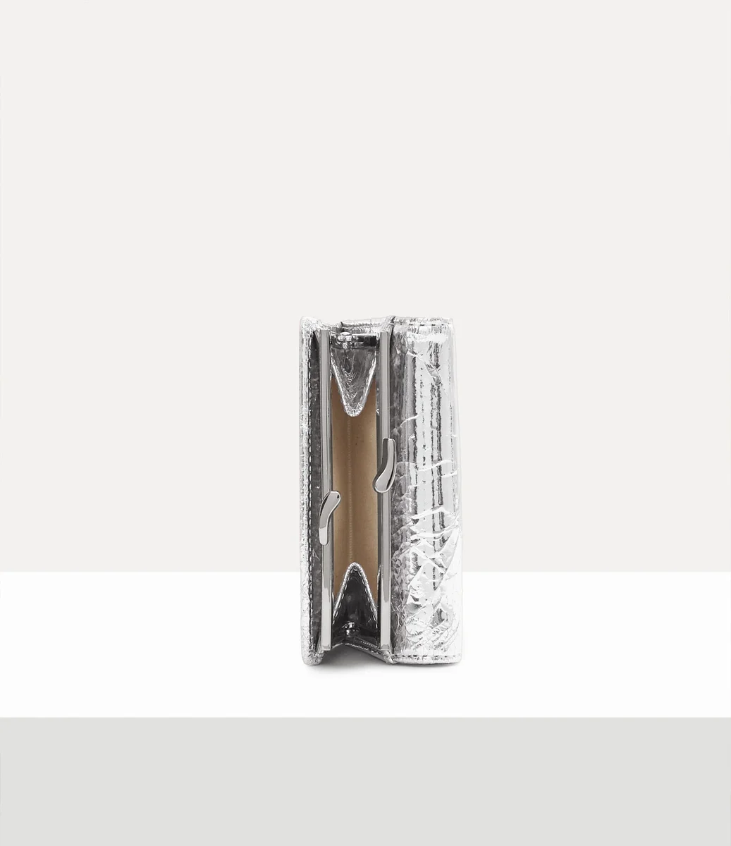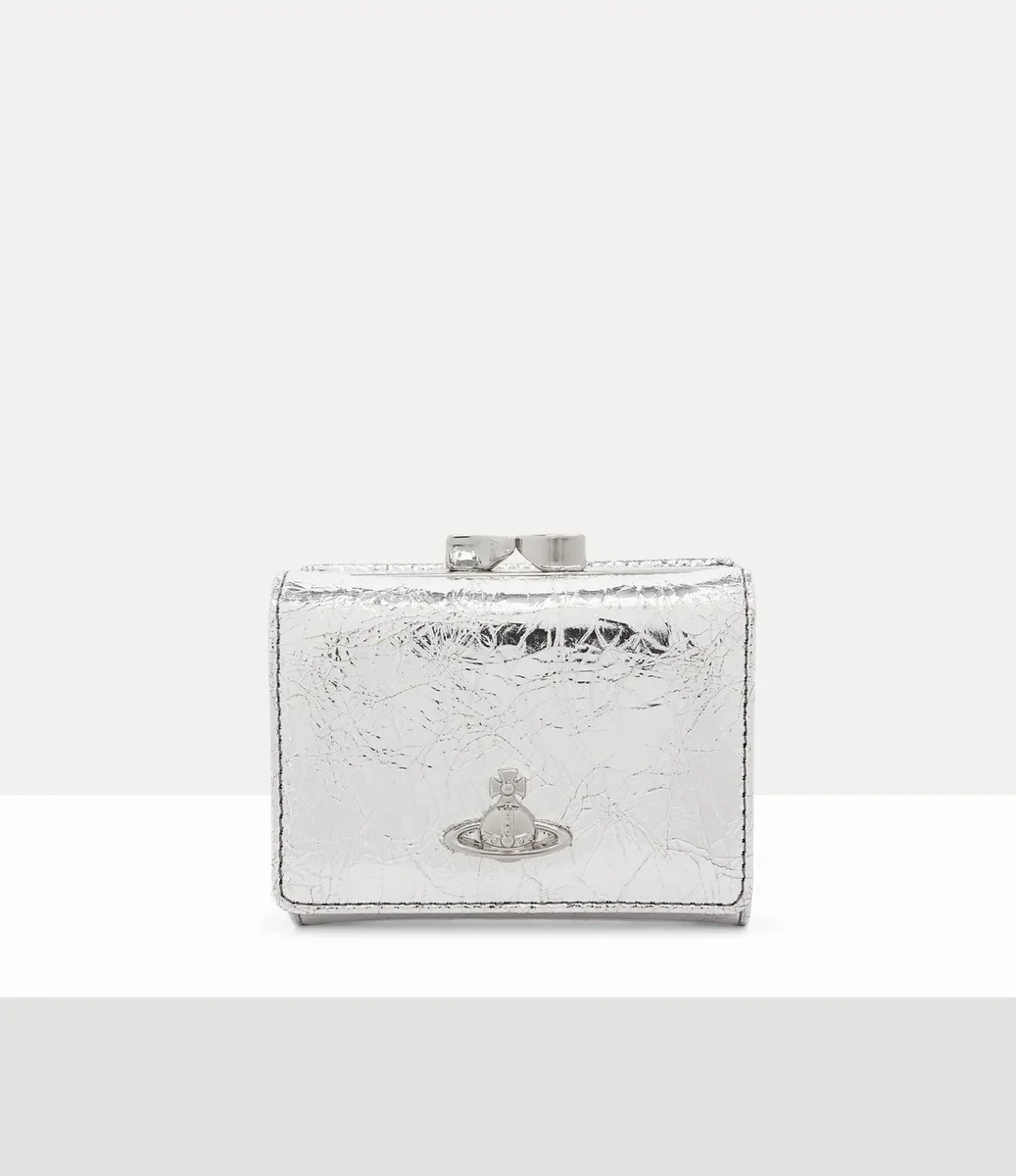 Vår Small Frame-plånbok har denna säsong en metallisk skrynklig läderdesign, inspirerad av husets rika arkiv. Plånboken har ett organiserat interiör och är prydd med vårt basrelief-orb-motiv på framsidan – som symboliserar etoset att lansera det förflutna in i framtiden.