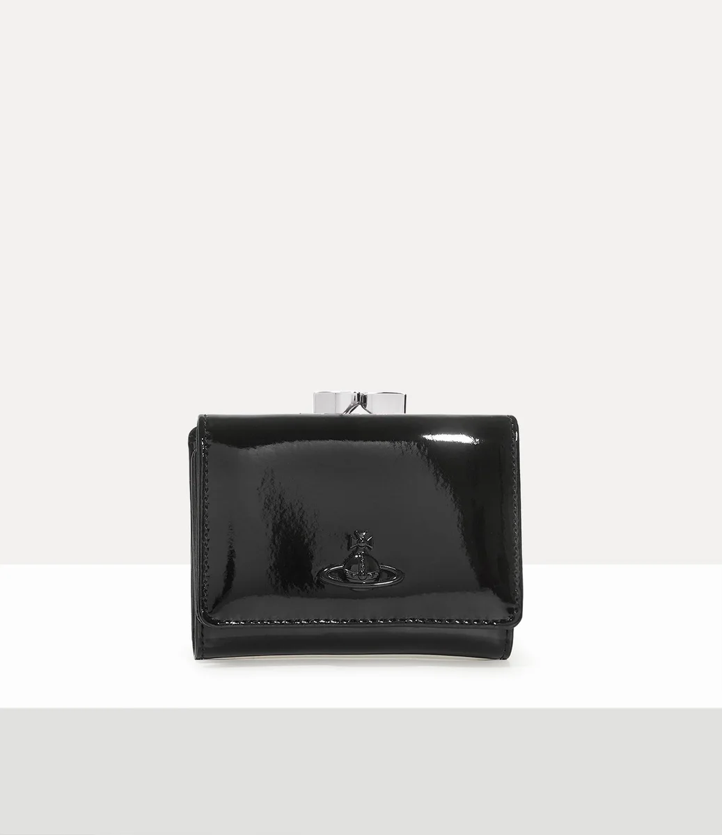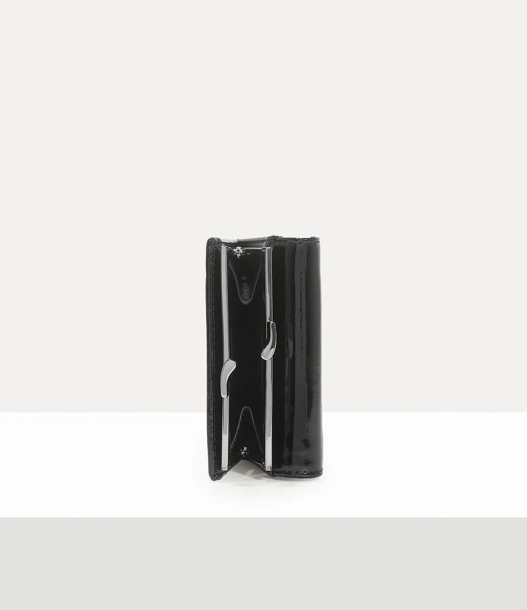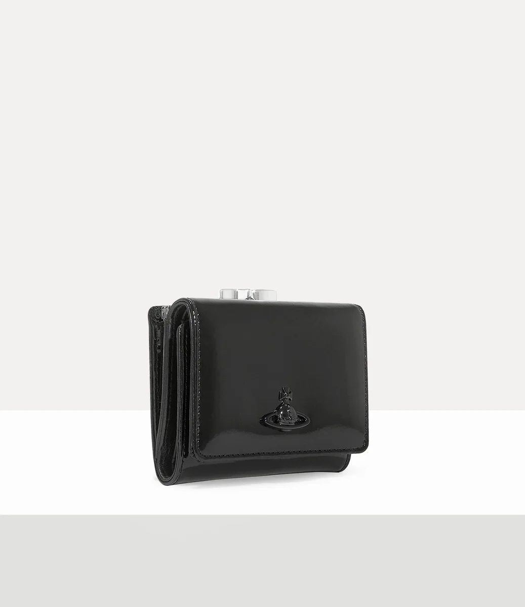Vår Small Frame-plånbok har en trefaldig lädersilhuett, prydd med en ton-i-ton basrelief-orb-plakett som symboliserar Viviennes vision om att föra traditionen in i framtiden. Den lackerade ytan, som påminner om flytande latex och gummikläder i vår ikoniska Sex-butik, återspeglar vårt hus signaturpunkestetik.