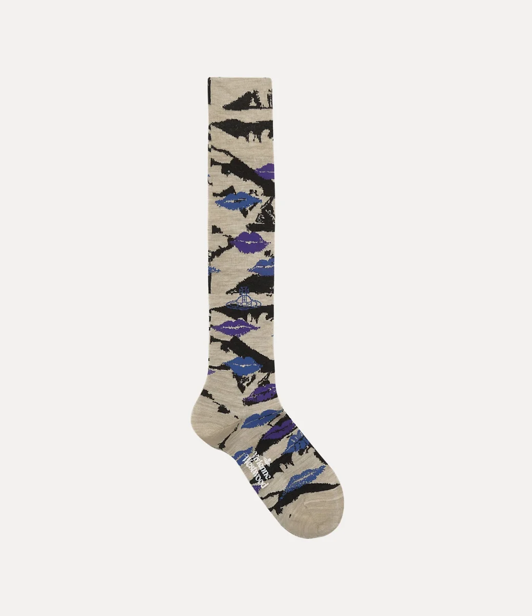 Den här säsongen har våra knälånga höga strumpor motivet ”Kisses”, inspirerat av förpackningen till husets parfym Boudoir. Strumporna är tillverkade av en mjuk bomullsblandning och har det karakteristiska Orb-motivet – som symboliserar varumärkets filosofi att föra det förflutna in i framtiden.