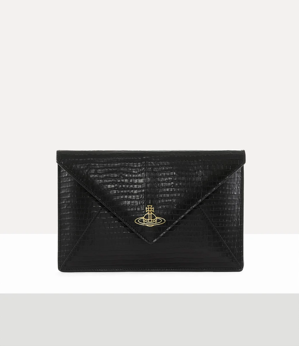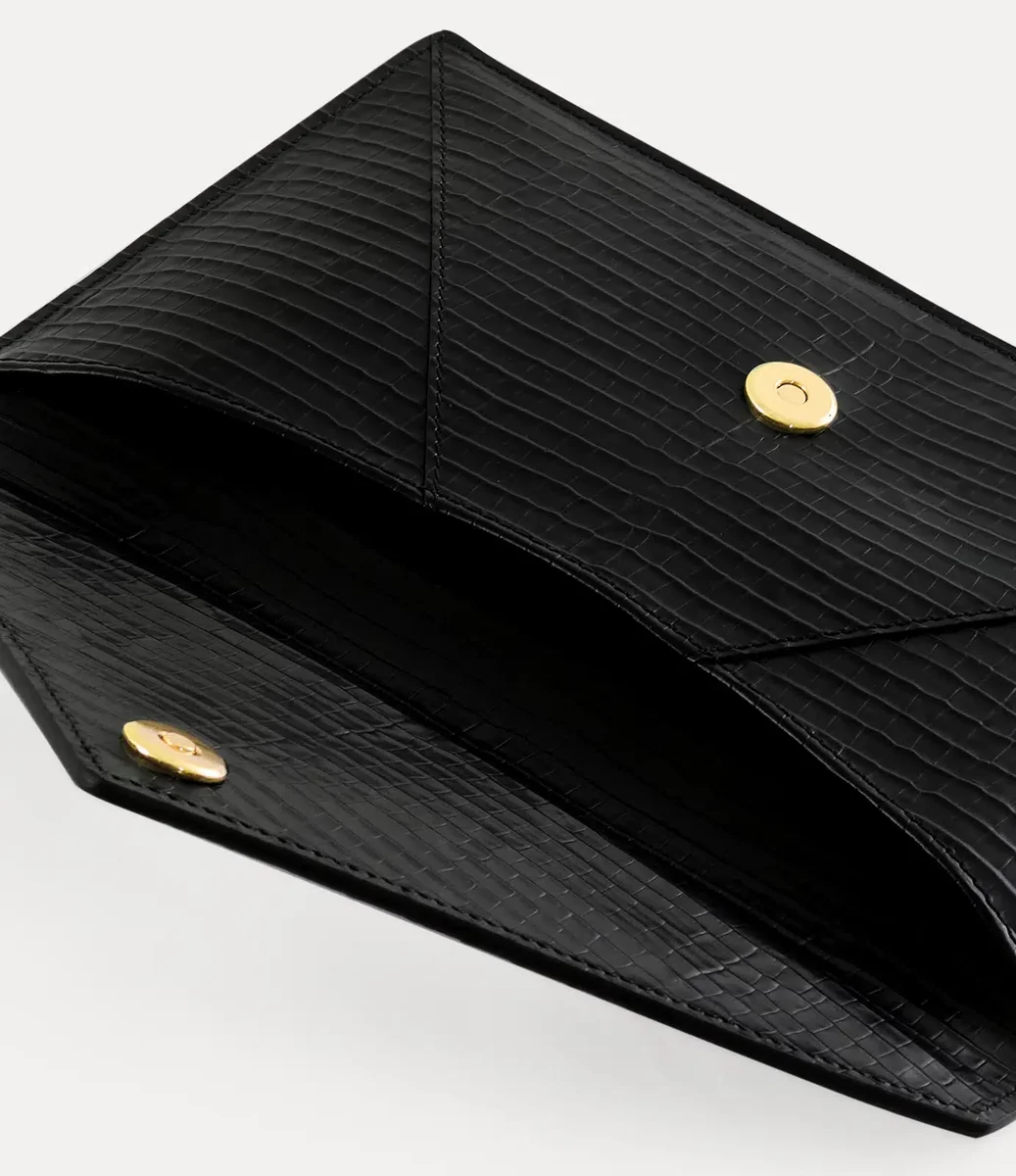 Den här säsongen har vår kuvertväska fått en ny design i säsongens subtila läder med krokodileffekt och med det karakteristiska orb-motivet på stängningen. Designen är avslutad med en delikat guldfolieprägling och är inspirerad av antika läderbordsskivor och vintage smyckeskrin.
