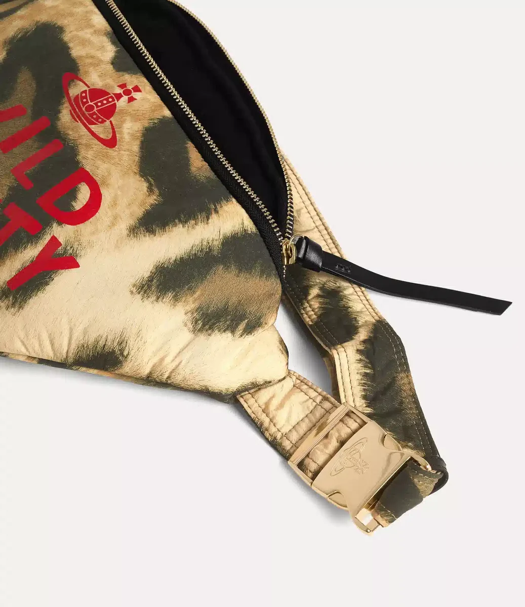 Vår Ada body bag har en halvmåneformad nylonprofil med ett djärvt leopardmönster som anspelar på vår höst-vinterkollektion 2001 Gold Label, ”Wild Beauty”. På framsidan sitter ett emblem i form av en glob ovanför sloganen ”Wild Beauty” i klarrött, medan en säker dragkedja upptill och en justerbar rem kompletterar designen.