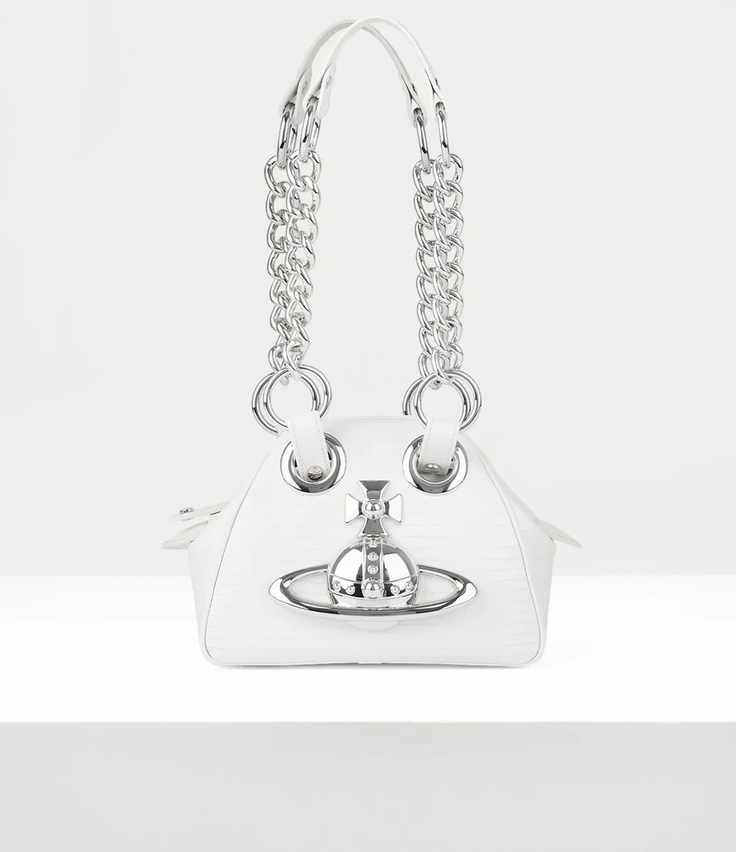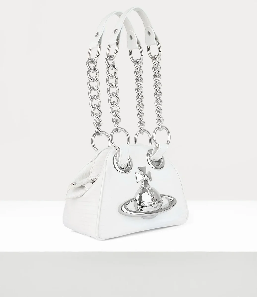 Vår handväska Archive Orb Chain, som först visades i Vivienne Westwoods vår-sommarkollektion 1991 ”Cut, Slash & Pull”, har fått en ny design denna säsong i ”Mini”-krokodileffektpräglat läder. Väskan har ett stort tredimensionellt globmotiv på framsidan, kompletterat med bondage-inspirerade ringar och kedjedetaljer längs remmarna.