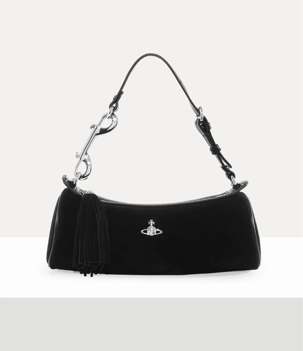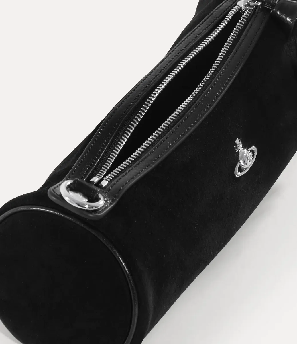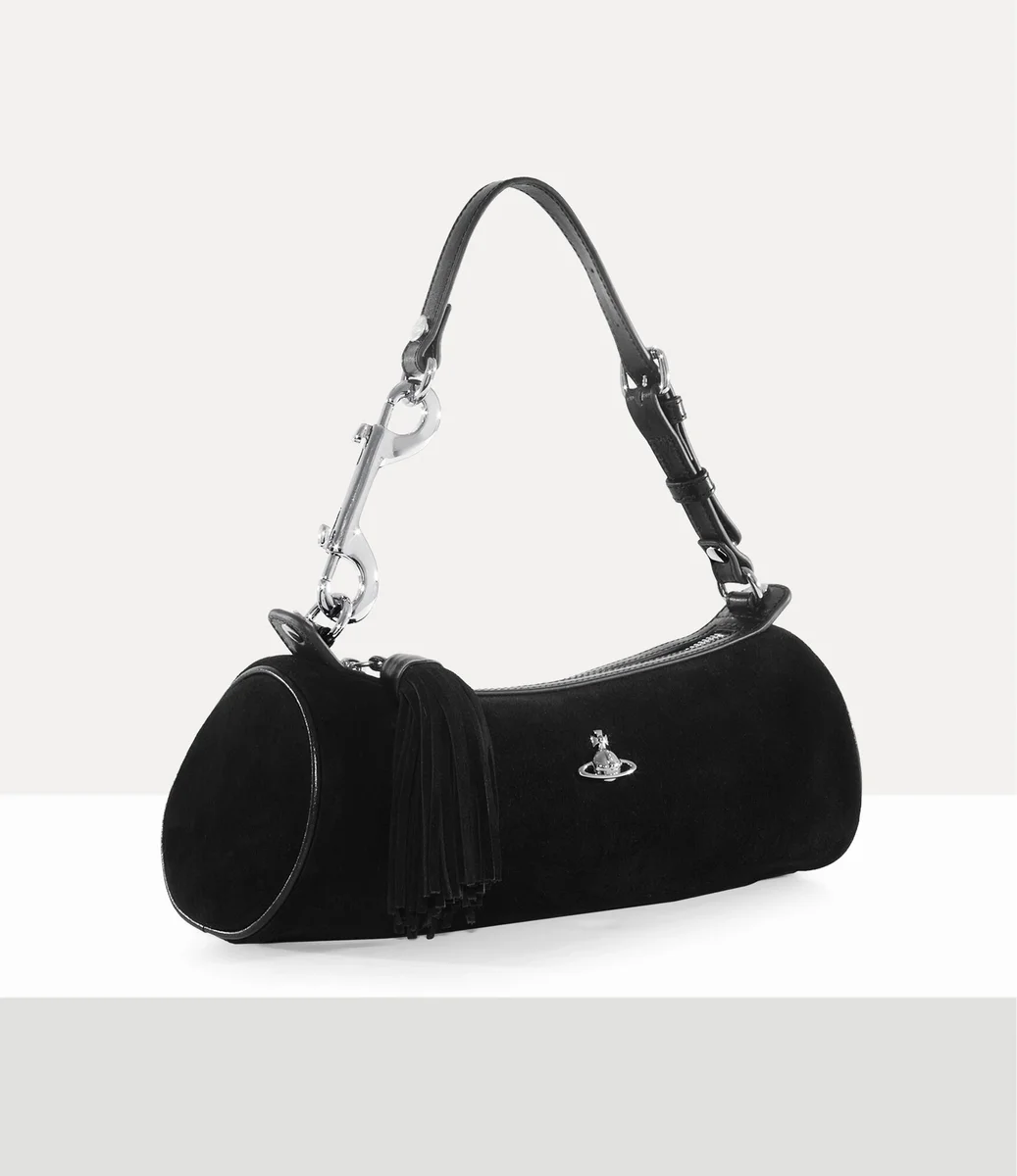 Vår Cindy Cylinder-väska finns denna säsong i mjuk mocka med husets signatur, en basreliefkula, på framsidan. Väskan har eleganta detaljer i metall, nämligen en hundklämma och D-ringdetaljer, som ger stilen en DIY-finish.