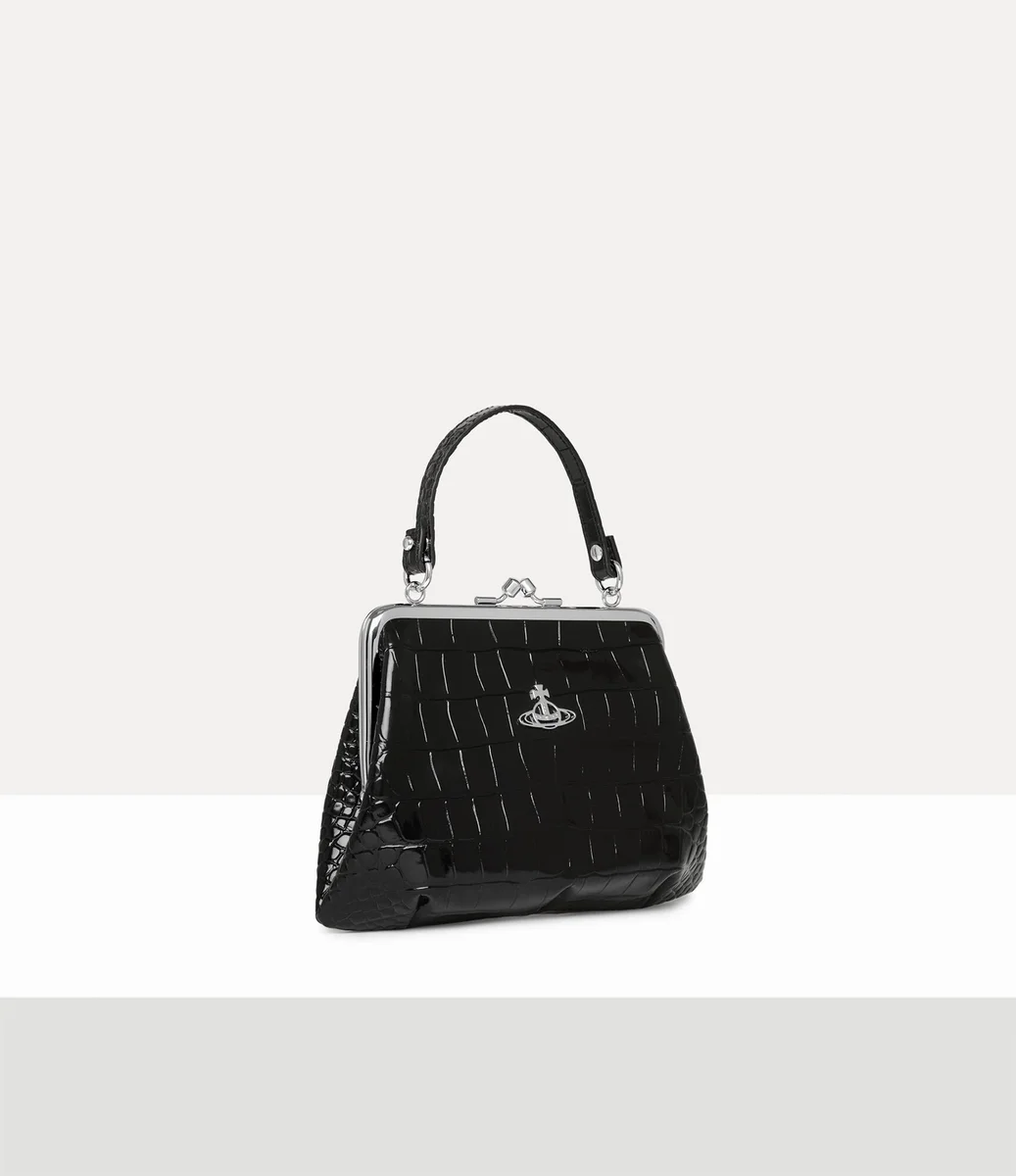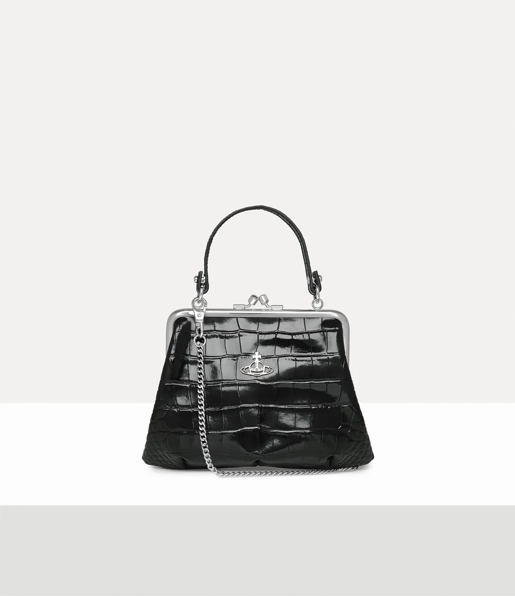 Silhuetten på Granny Frame-väskan påminner om antika myntväskor från tidigt 1900-tal, med en metallram och ett säkert kysslås. Väskan har en krokodileffekt över hela designen, kompletterad med vårt klassiska linjemotiv på frontpanelen, som är synonymt med modehusets filosofi att föra det förflutna in i framtiden.