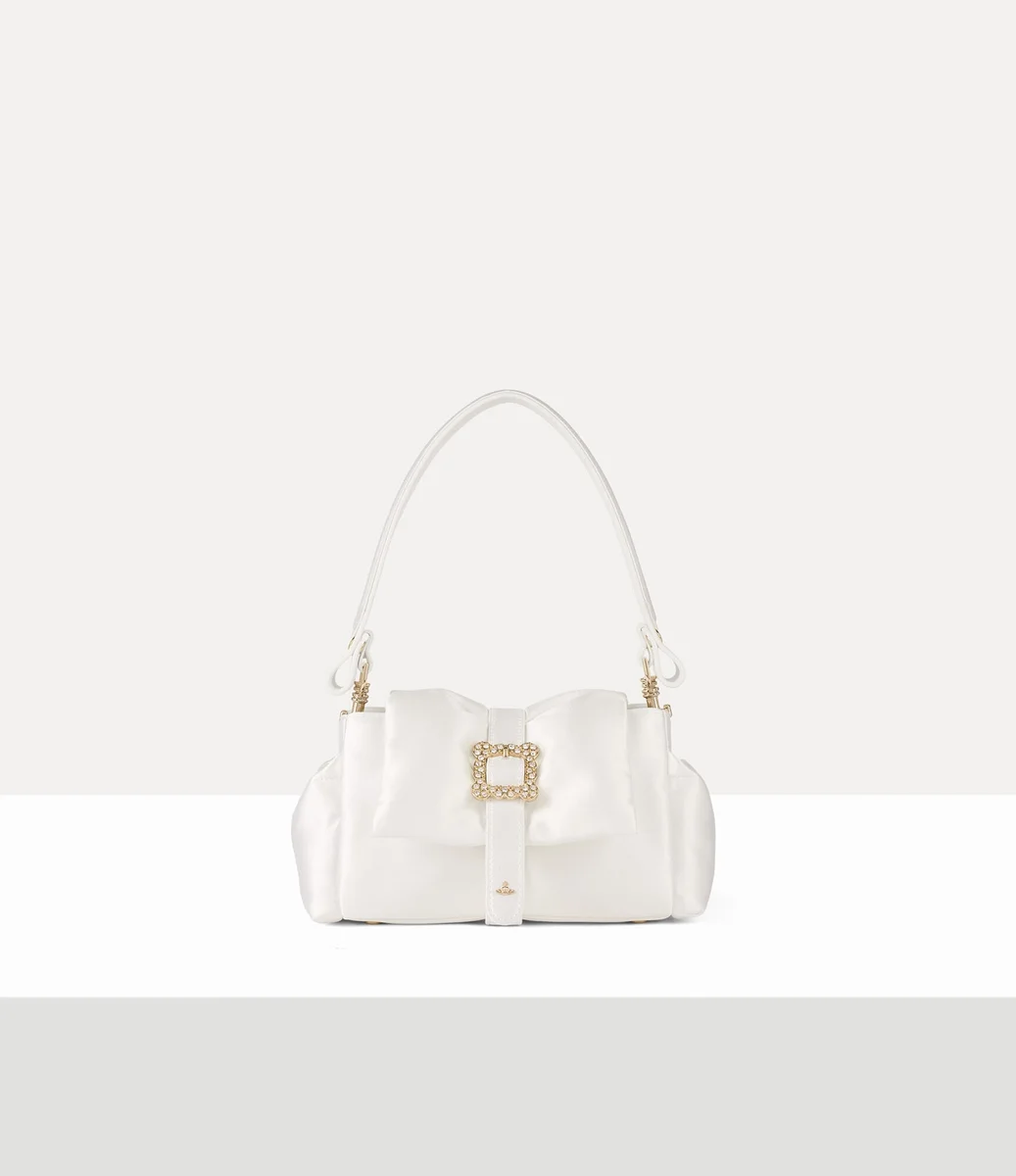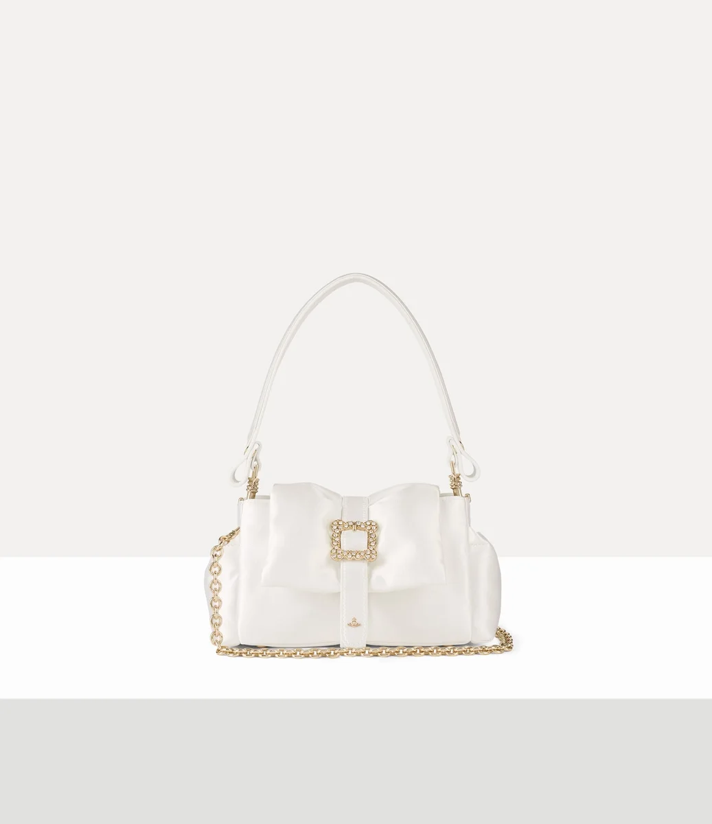 Vår Hazel Mini Treasure handväska är tillverkad av en silkesblandning och har ett topphandtag, komplett med vårt signaturmönstrade pastellblå foder och polerade metalldetaljer. En skulptural bältesrem omsluter den mjuka silhuetten, prydd med en dekorativ kulcharm och avslutad med ett överdådigt kristallbesatt ramspänne, som påminner om Viviennes vördnad för konsthistorien.p>