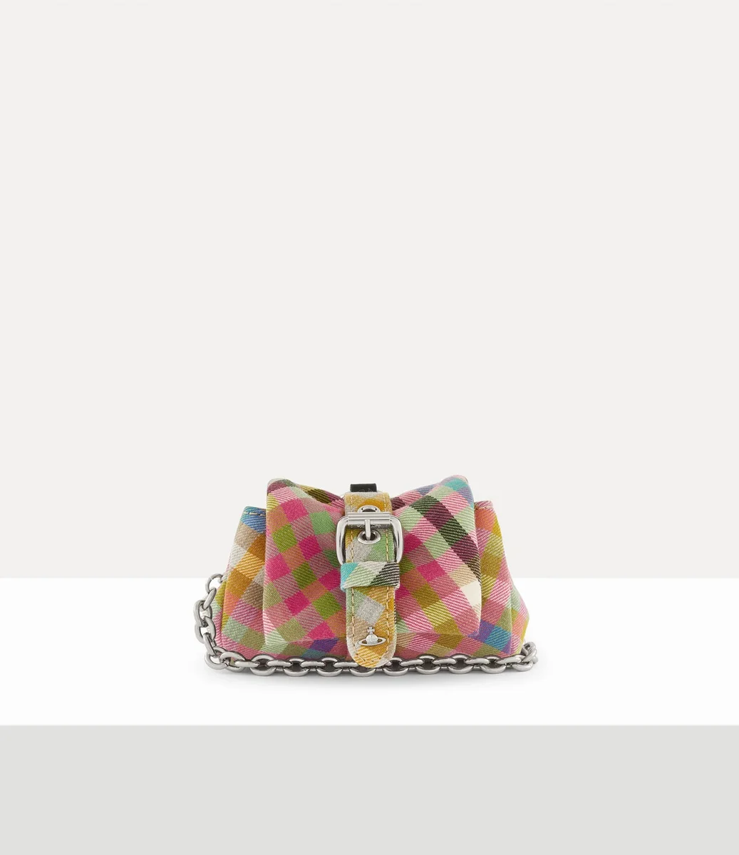 Vår Hazel Treasure Charm handväska är en ny tolkning av husets signaturdesign ”Hazel Treasure” och har säsongens livfulla ”Heather Check”-motiv i ull. Den är tillverkad med en skulptural bältesrem som omsluter den mjukt strukturerade silhuetten och är avslutad med vårt basrelief-emblem på framsidan.