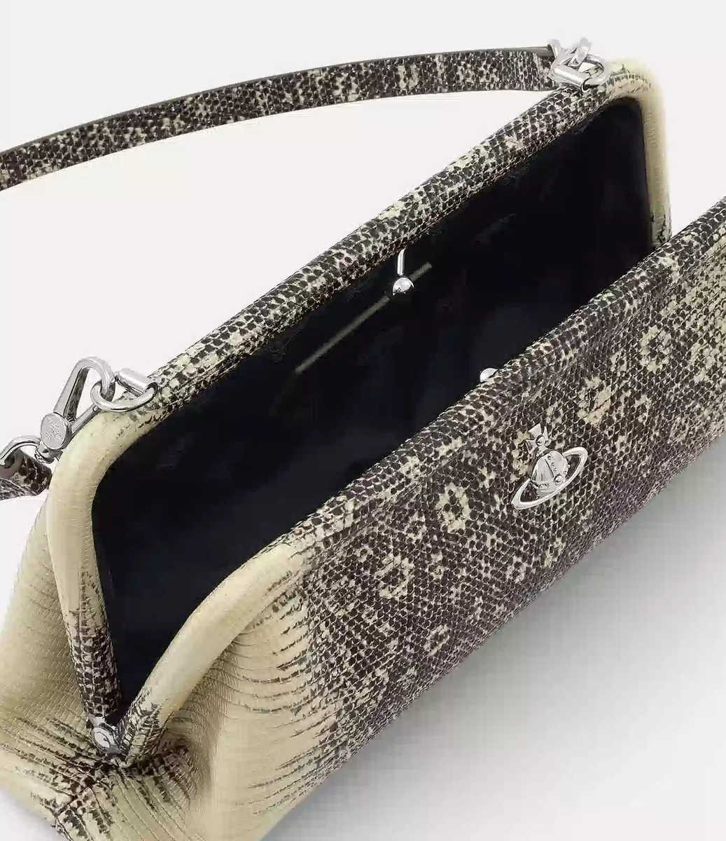 Jane Frame-plånboken är inspirerad av husets ikoniska ”Granny”-stil och påminner om 1900-talets myntplånböcker med sin exponerade polerade ram och kysslås. Den är tillverkad av läder och har säsongens tvättade motiv med ödleeffekt och en långsträckt silhuett.