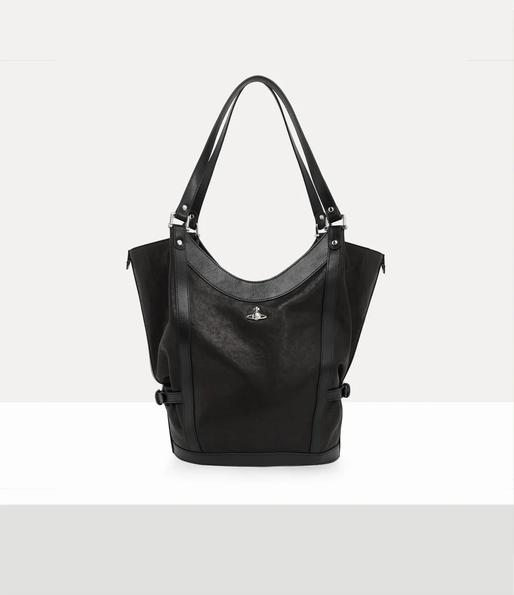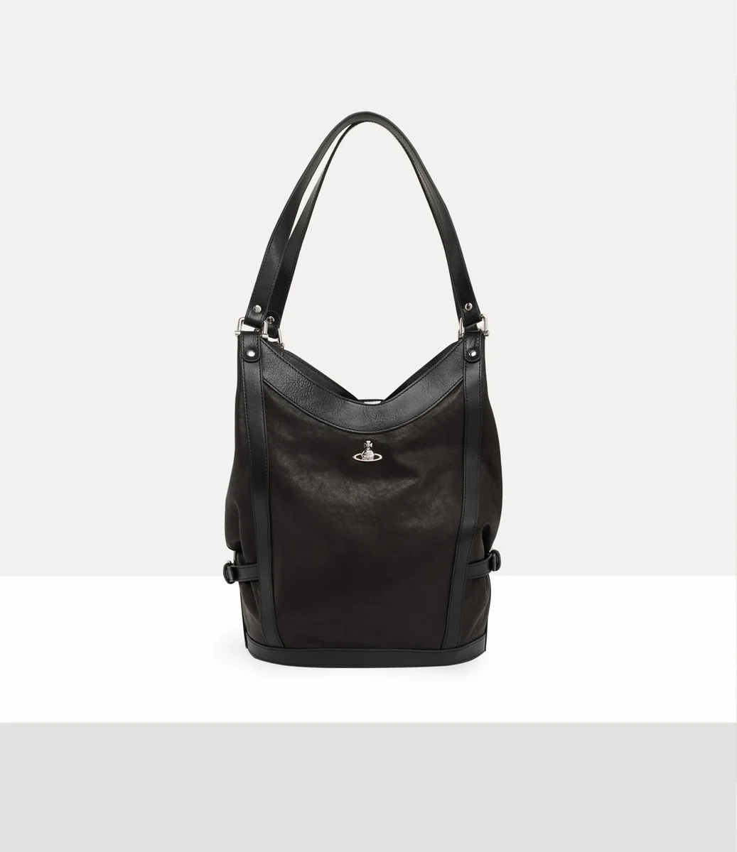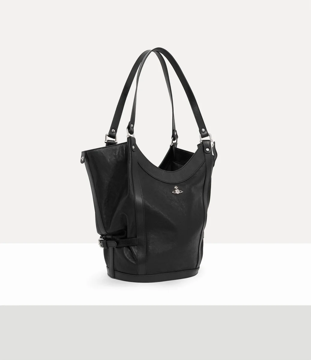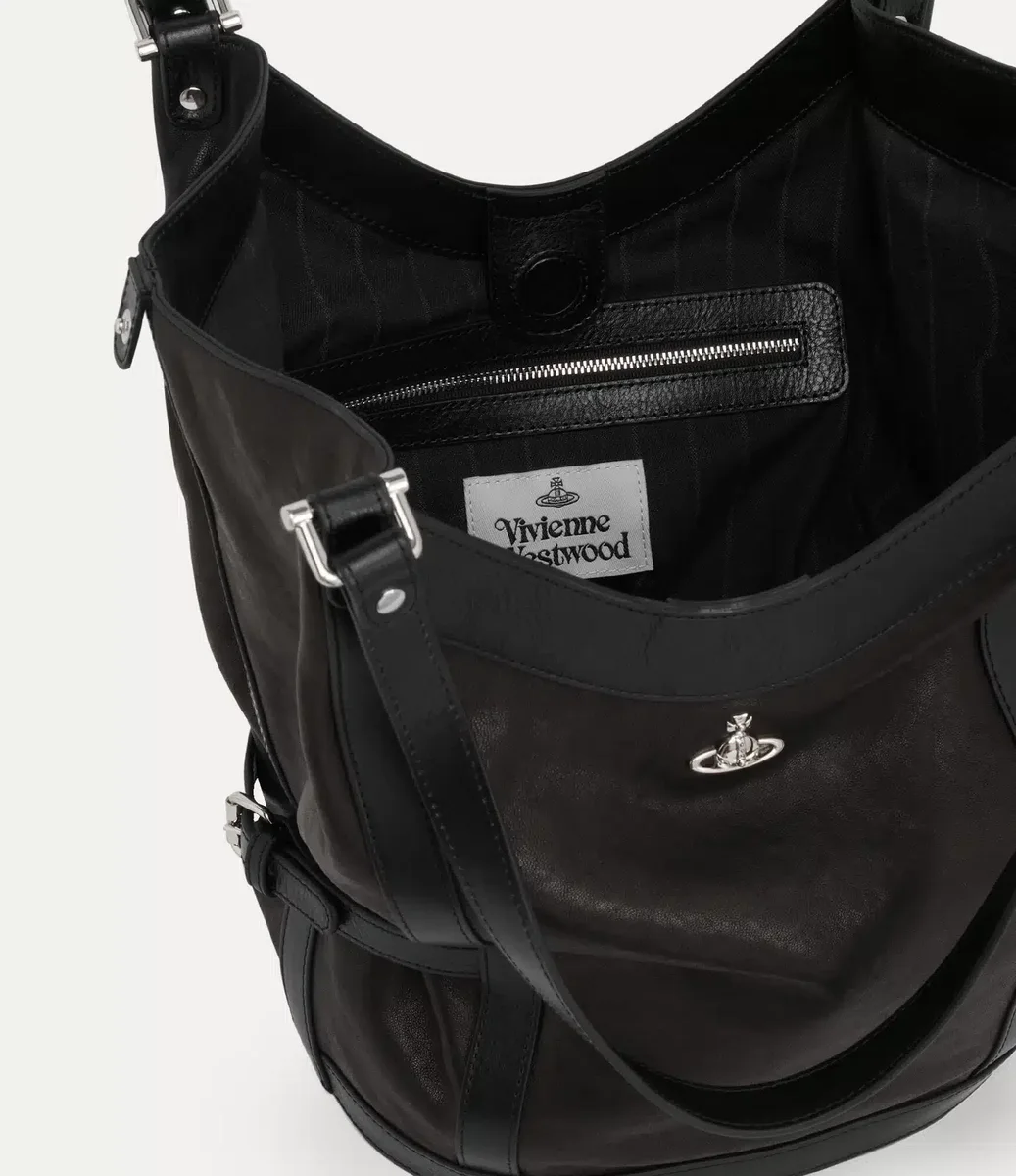 Olive Large Shoulder Bag är tillverkad av mjukt läder och fodrad med vårt signaturmönster ”Broken Pinstripe”, som först introducerades i Viviennes Gold Label höst-vinterkollektion 2015. Den har en mjuk, slapp silhuett och är detaljerad med remmar i bondagestil som snörs åt som en sele.