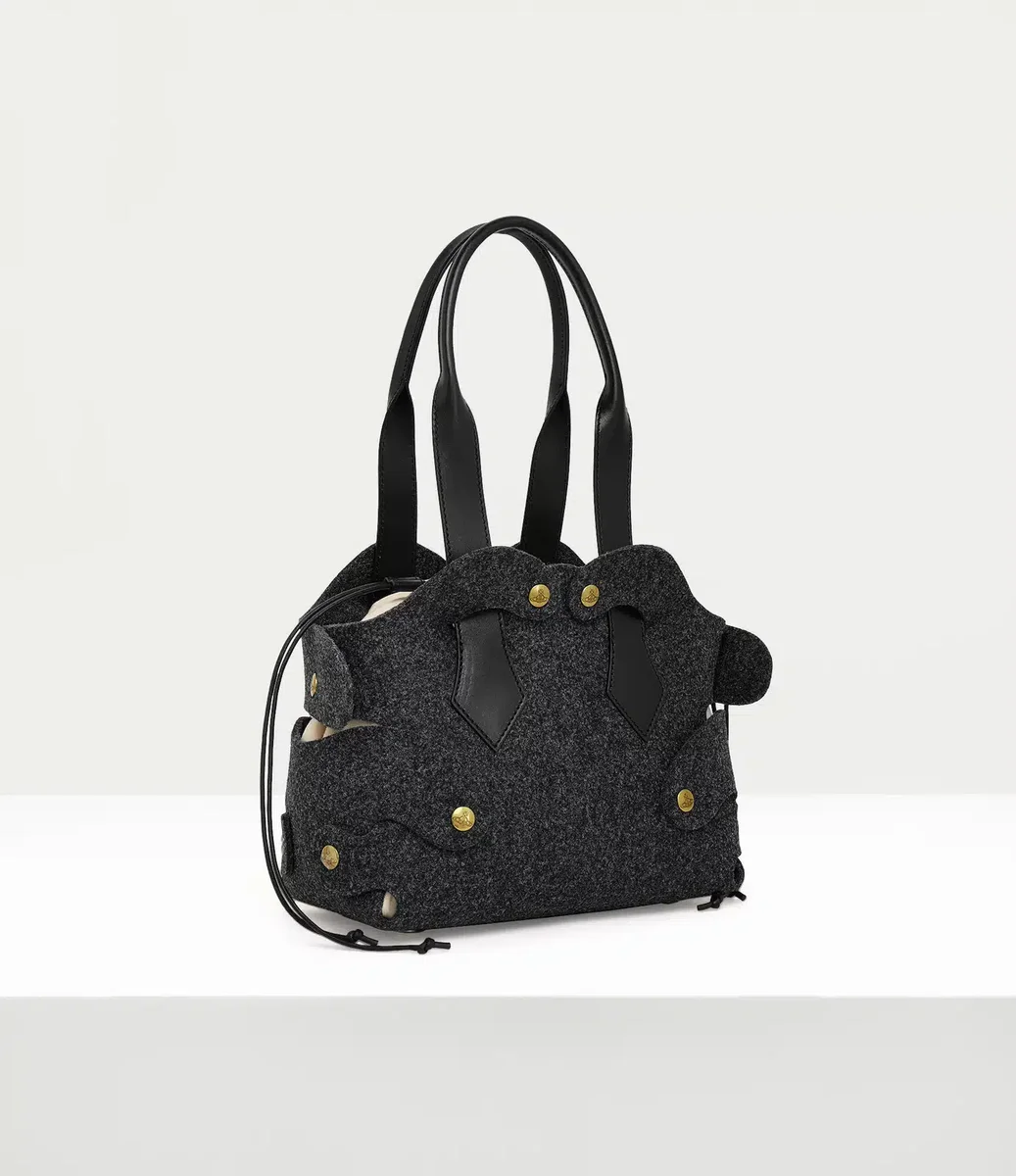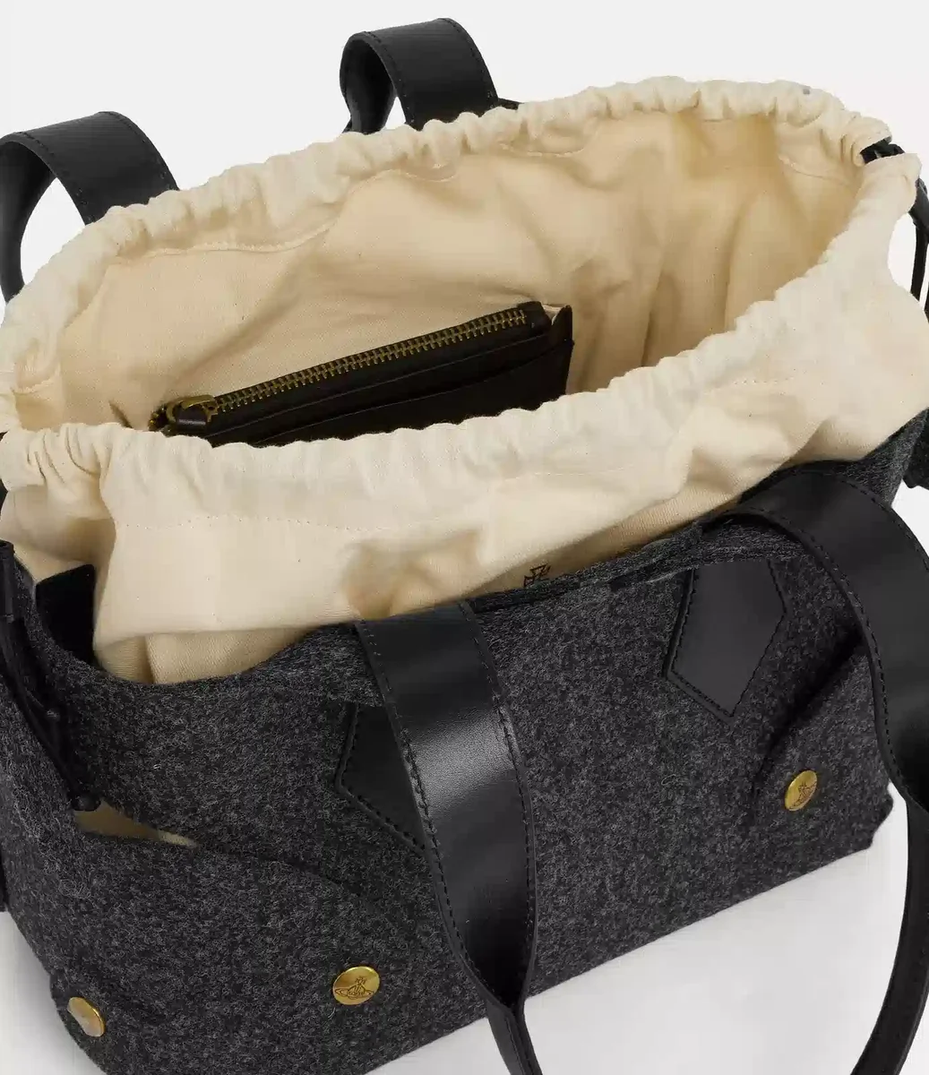 Vivienne Westwood Wilma Small tote är tillverkad av tjock ullfilt och har ett modulärt tryckknappsystem med signaturhandtag i form av spjutspetsar.