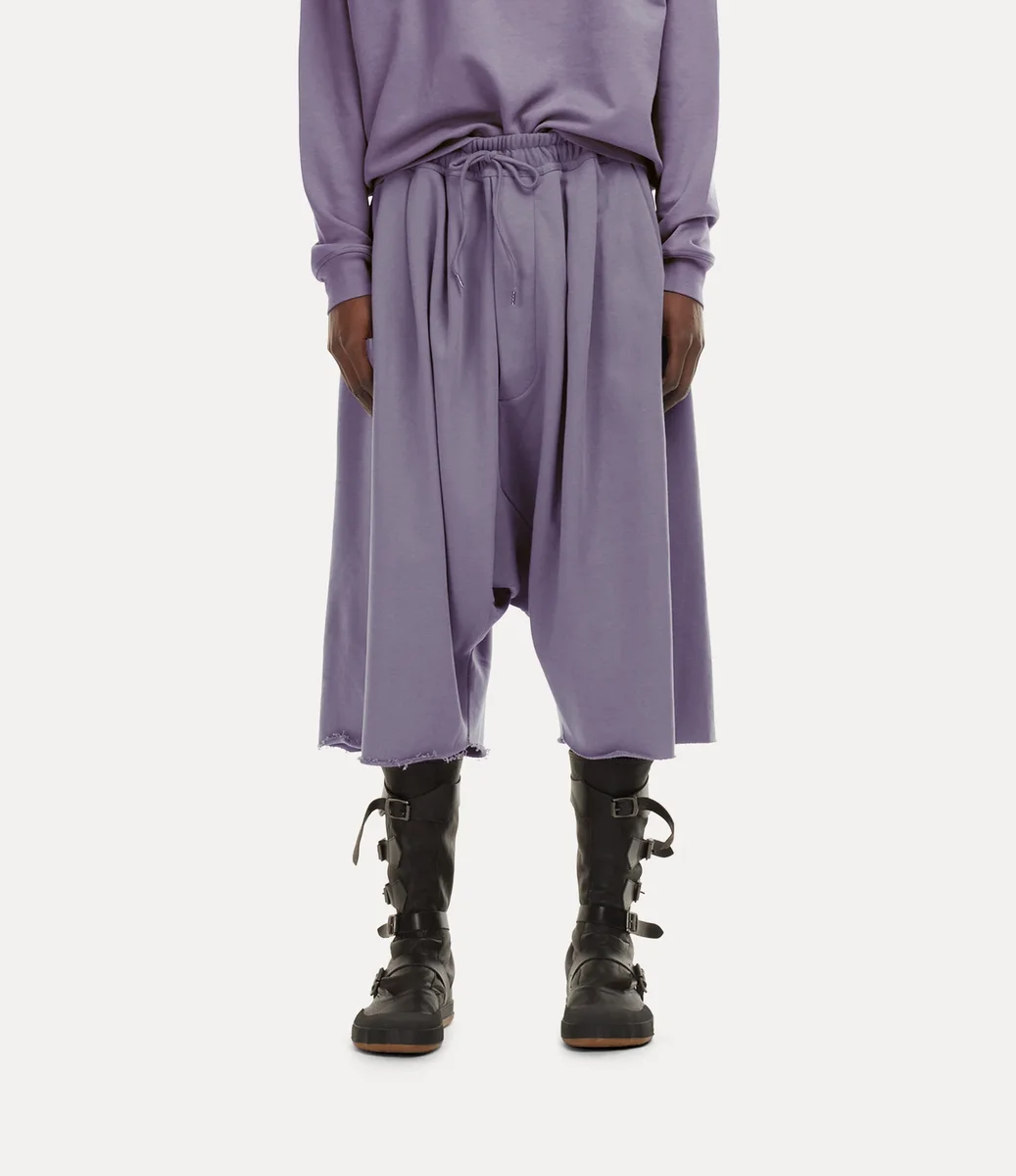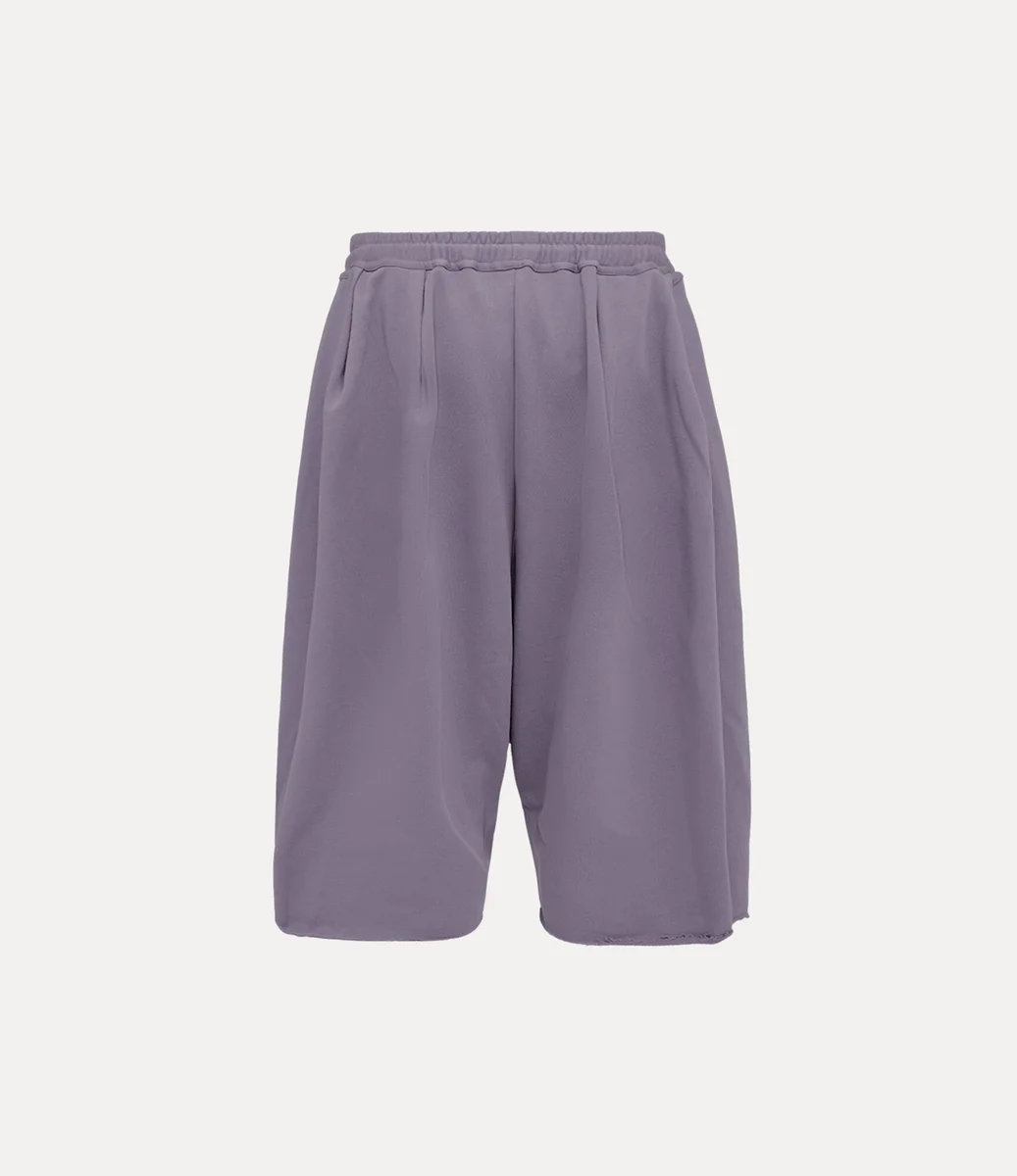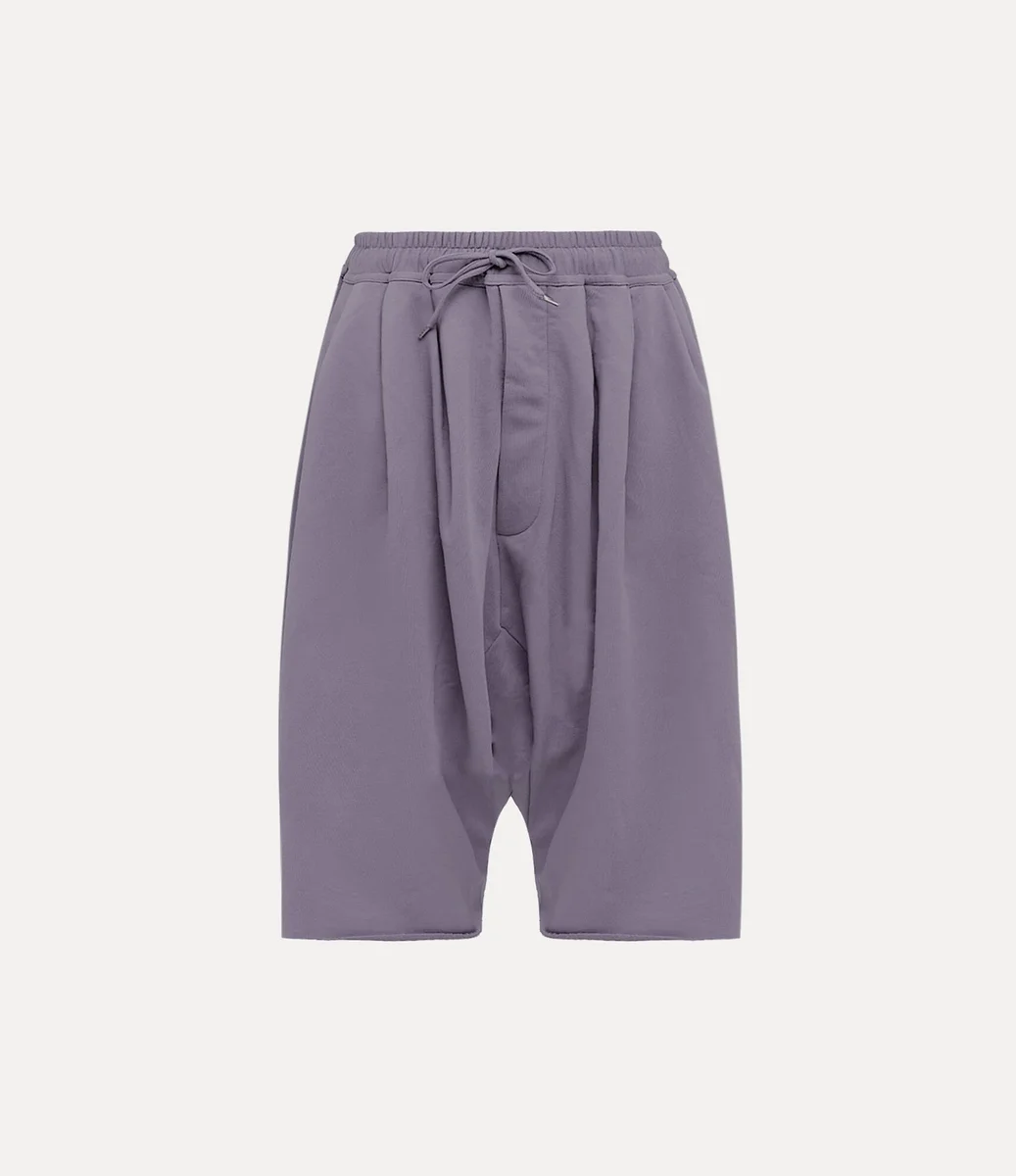 Våra ballongshorts har en medelhög, elastisk midja som övergår i en voluminös, draperad silhuett med lågt skritt och råa fållar som faller under knäet. Plagget har två djupa sidfickor och dragsko med metallspetsar för justerbar passform.