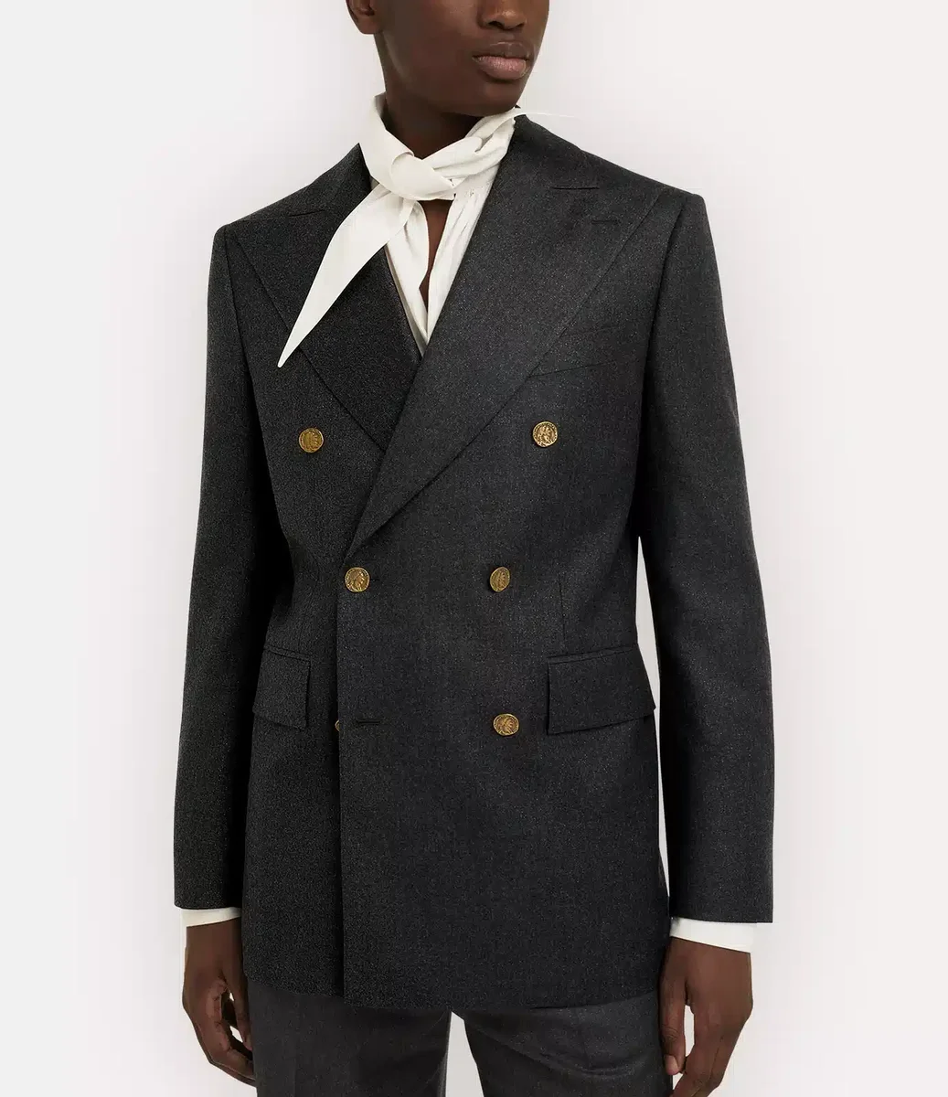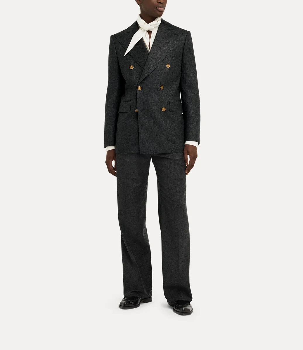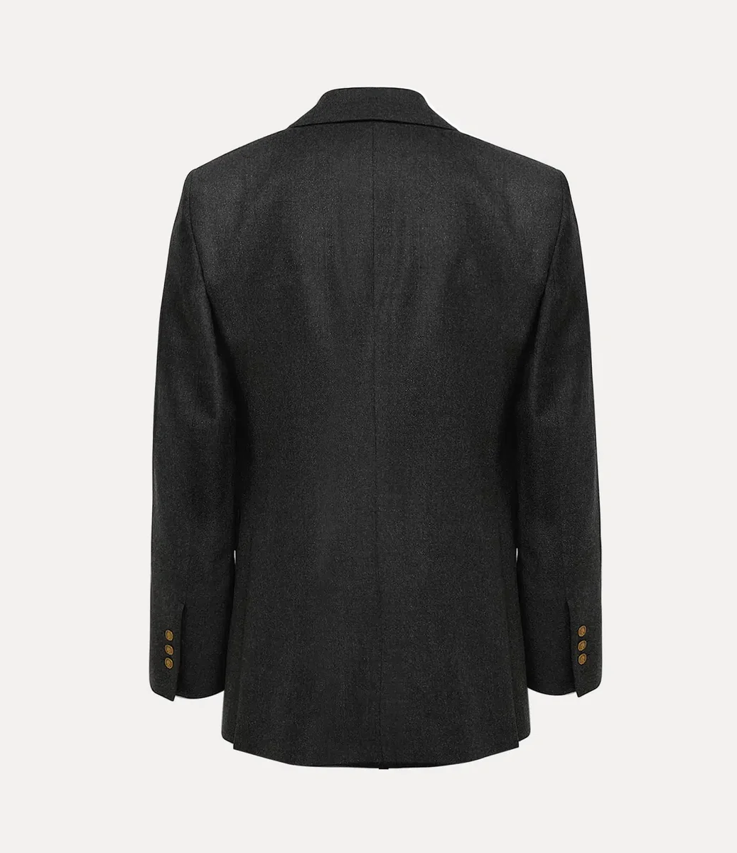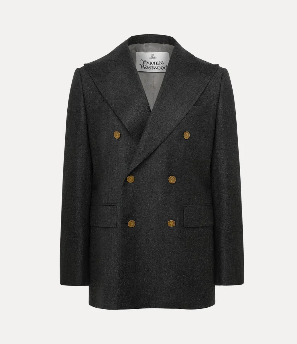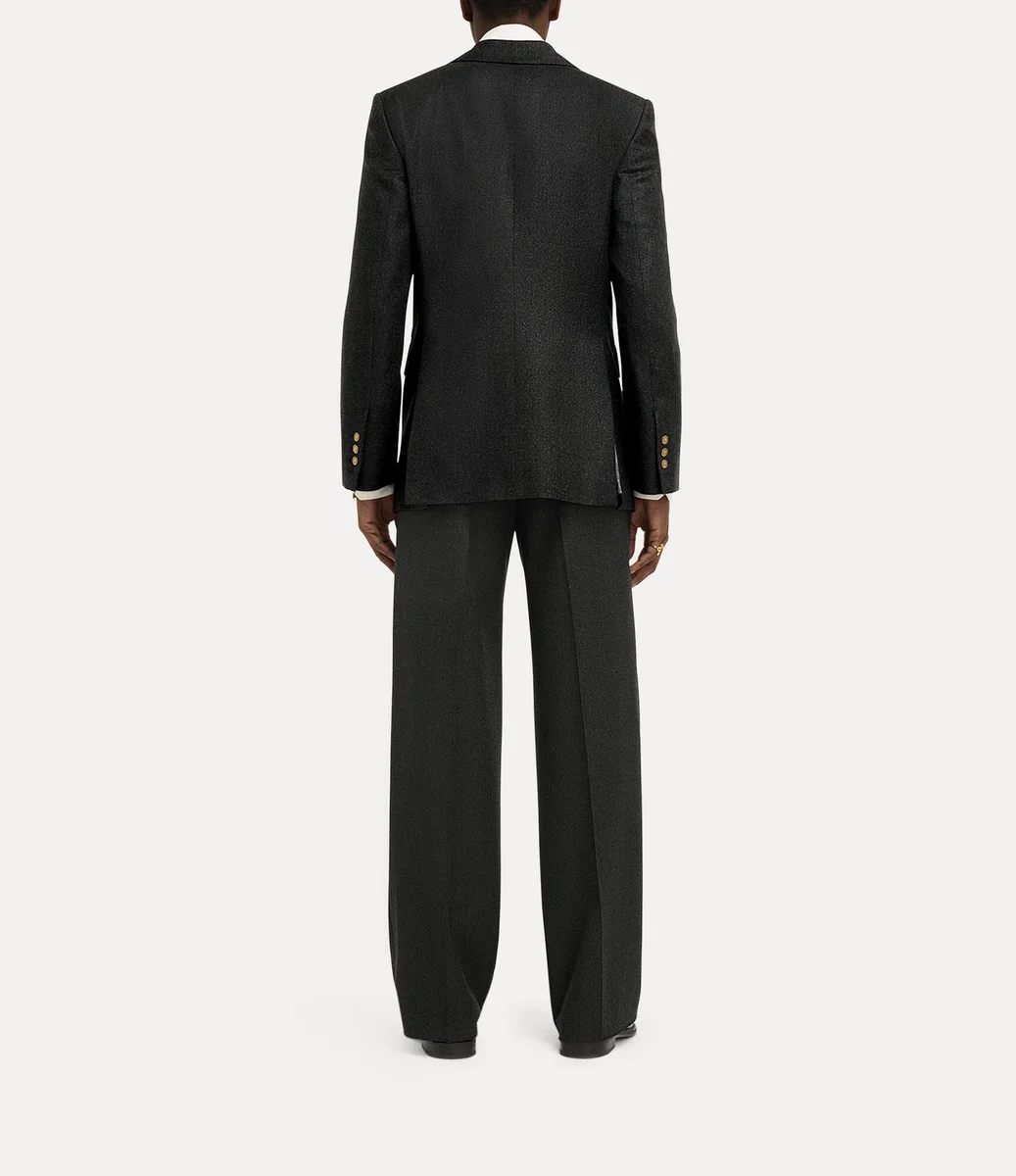 Vår Captain-jacka har en ullprofil, fint vävd med en metallisk borstad yta. Silhuetten ramas in av skarpa spetsiga slag och faller till en ren fåll med slitsar bak, komplett med vårt ”Tossed Orb”-foder – synonymt med Viviennes vision om att föra traditionen in i framtiden.