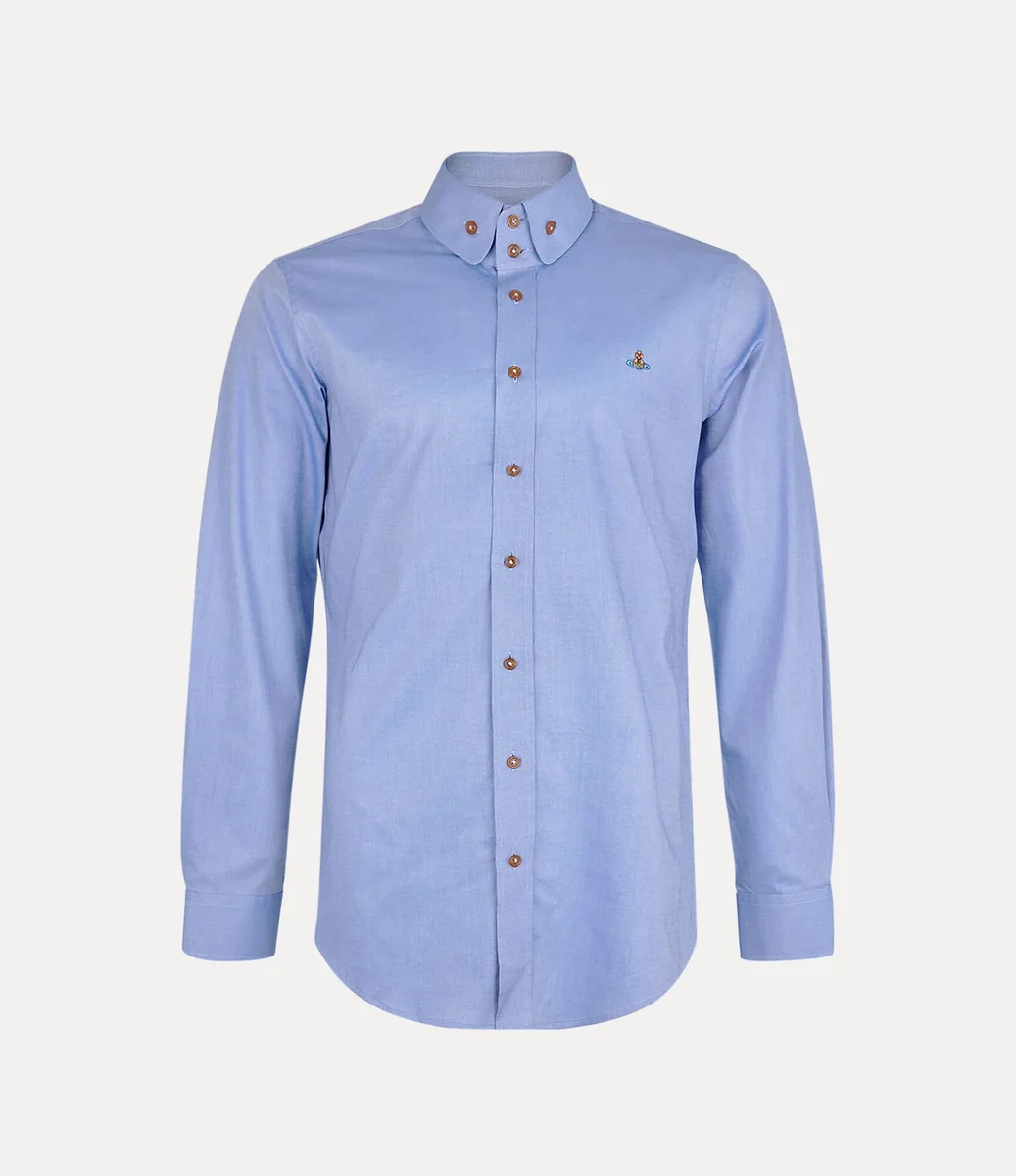 Skjortan Two Button Krall kännetecknas av Viviennes tvåknappshalsringning och rundad krage, kompletterad med en lätt rundad fåll. Den långärmade designen har en broderad glob som symboliserar tradition, omgiven av Saturnus himmelska ringar som symboliserar framtiden.