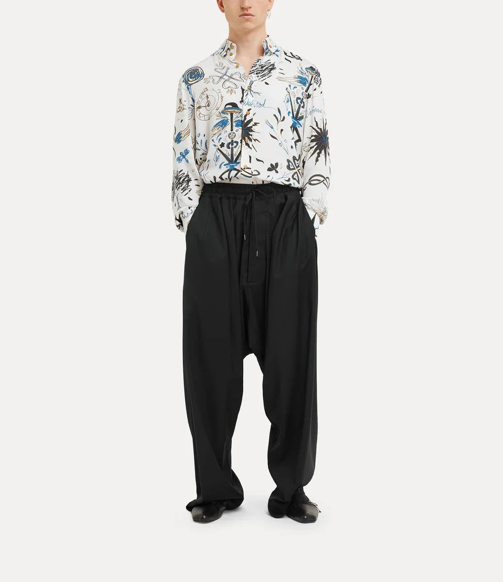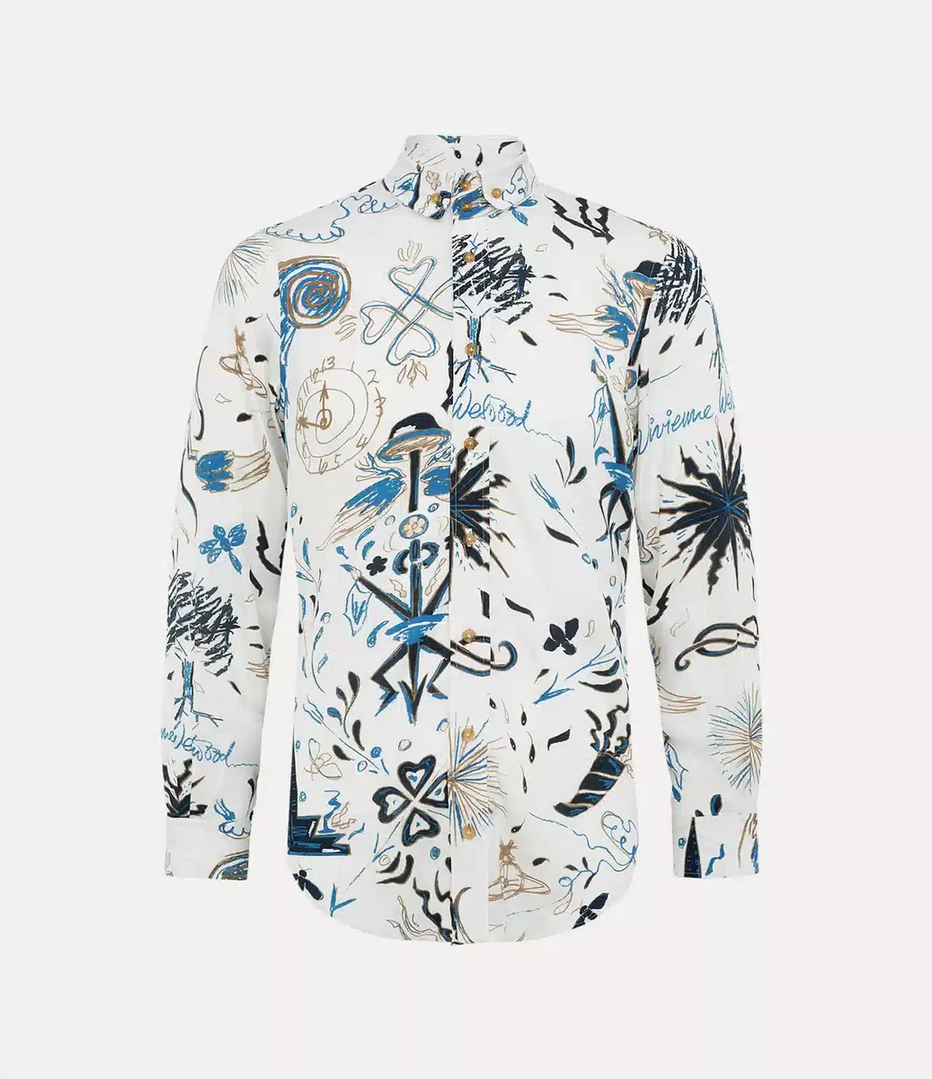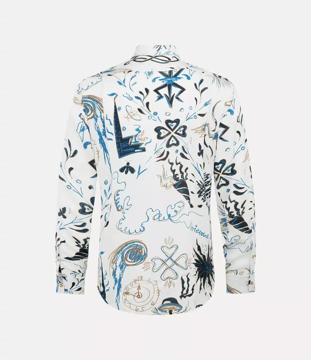 Silhuetten på Two Button Krall-skjortan är inspirerad av en arkivdesign med Viviennes signaturkrage med två knappar. Inspirerad av Frans Hals målning ”The Laughing Cavalier” är plagget tryckt med ett abstrakt grafiskt mönster som innehåller husets signaturikonografi.