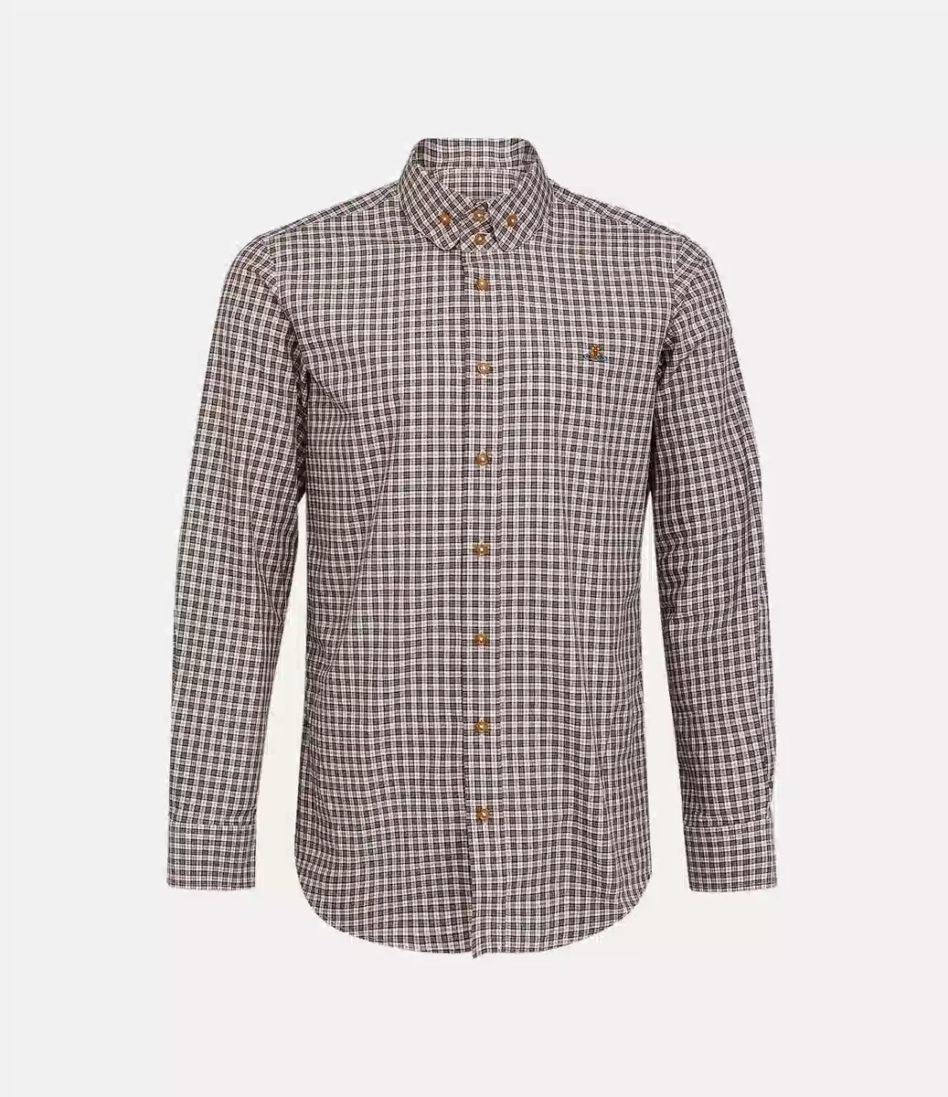 Vivienne Westwoods skjorta Two Button Krall har märkets signaturkrage med två knappar och ett djärvt rutmönster över hela designen.