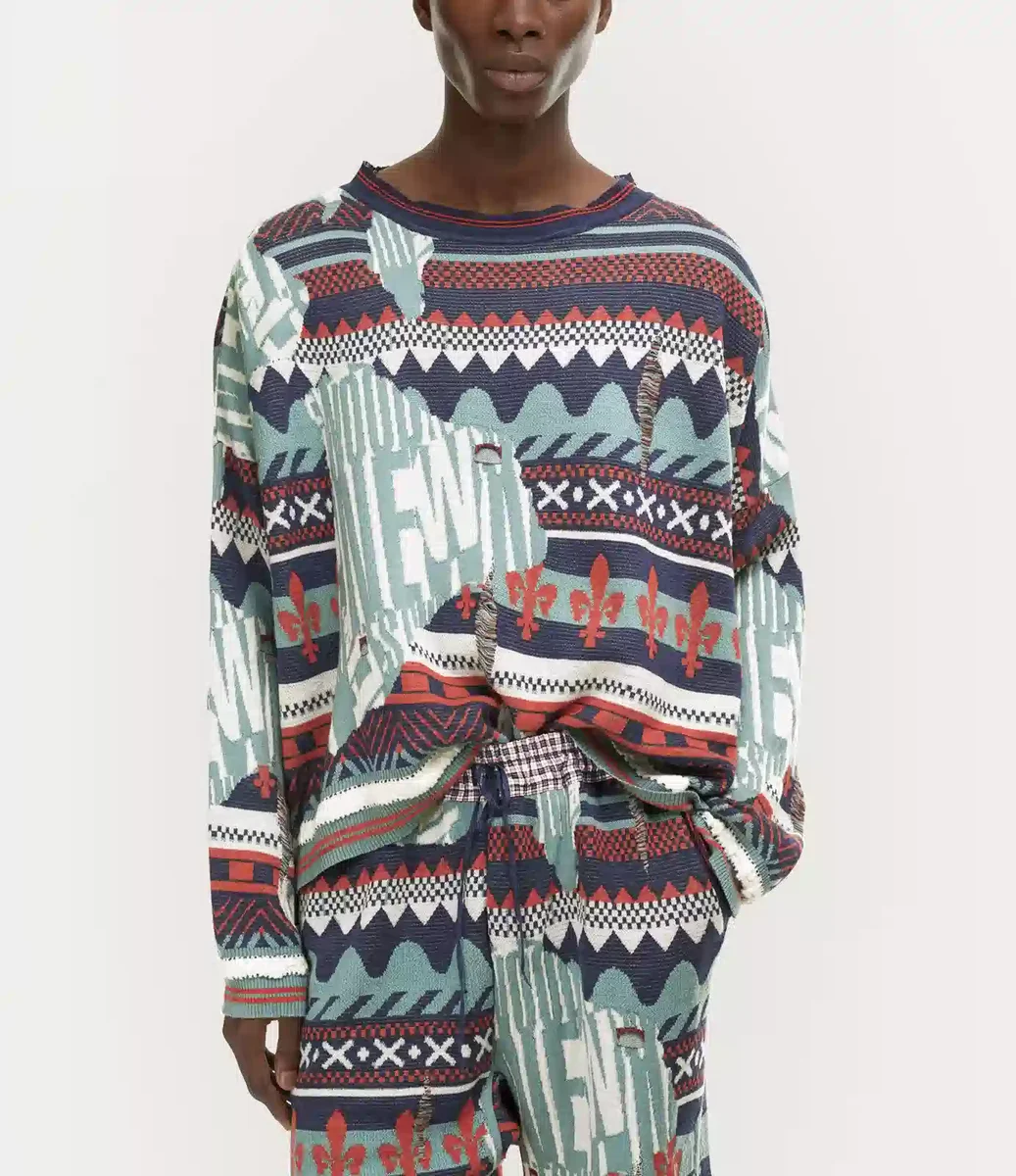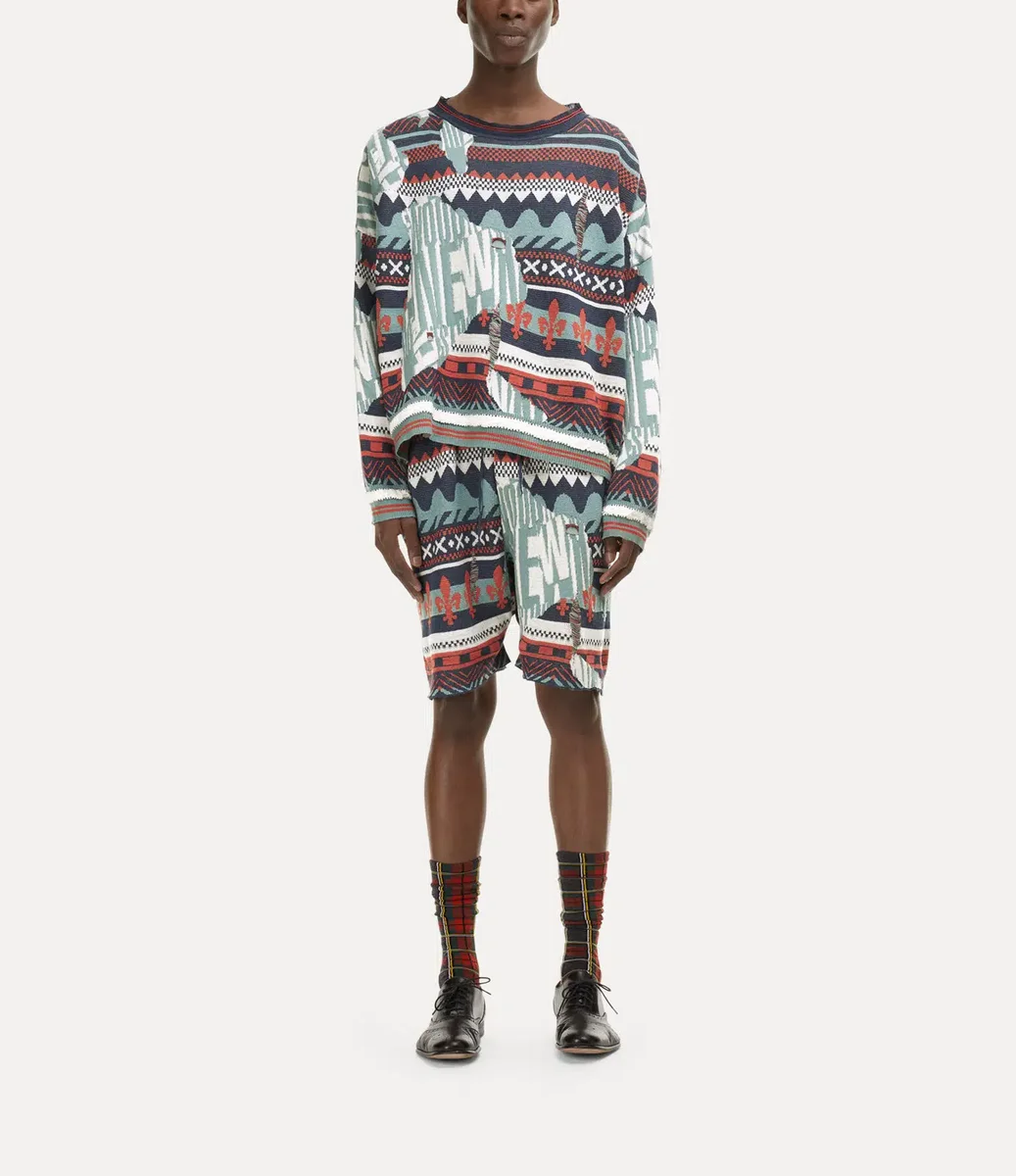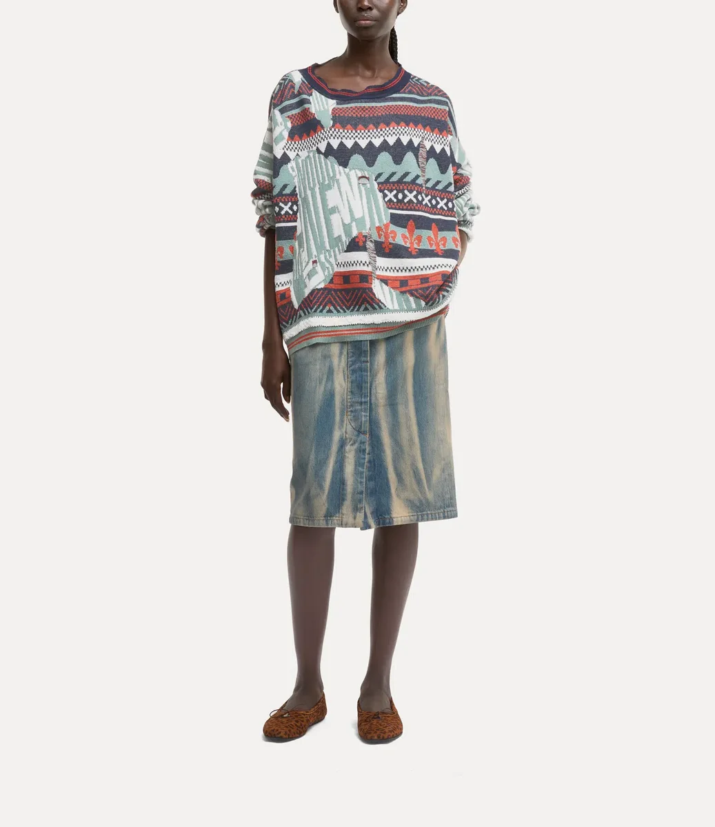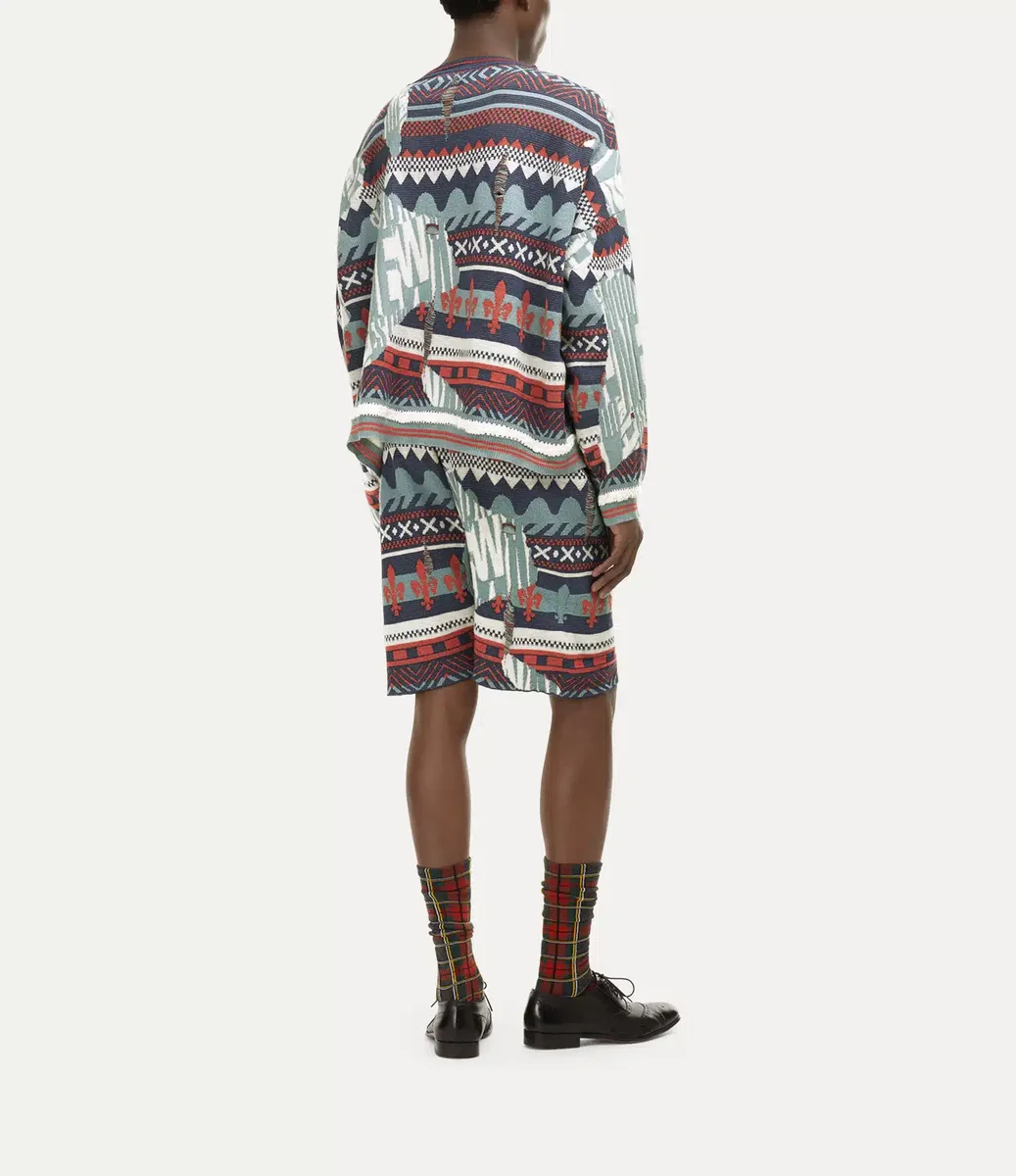 Vår Broken Fair Isle-tröja har säsongens Fair Isle-jacquard, vävd med husets signaturikonografi och blekta partier där motivet med bokstäverna ”Vivienne Westwood” subtilt framträder. Plagget kompletteras med intrikata slitna detaljer som skapar en dekonstruerad estetik.