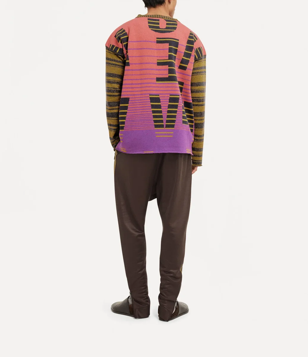 Vår Bruno-tröja är tillverkad av en bomulls-ullblandning med rund halsringning och avslappnad silhuett. Plagget har säsongens randiga ”Logomania”-jacquard med en gradient-effekt, avslutad med en rullad fåll och husets signatur ”TV”-stickning på ärmarna, som påminner om en suddig signal.