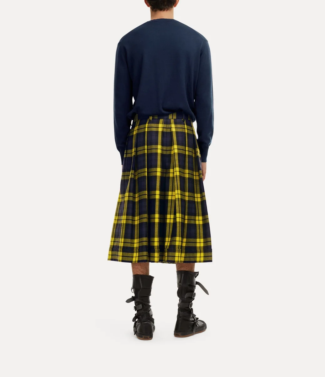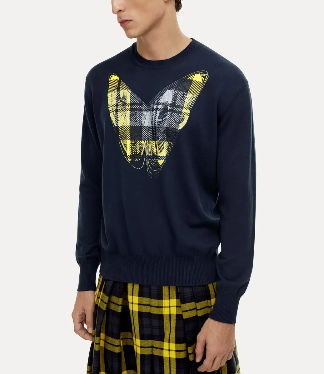 Chaos-tröjan har ett fjärilsmotiv i mitten av designen, som hyllar husets signaturikonografi, tryckt med säsongens livfulla tartanmönster ”Chaos”. Plagget har en klassisk rund halsringning med långa ärmar och rak fåll, avslutad med raffinerade ribbade kanter.