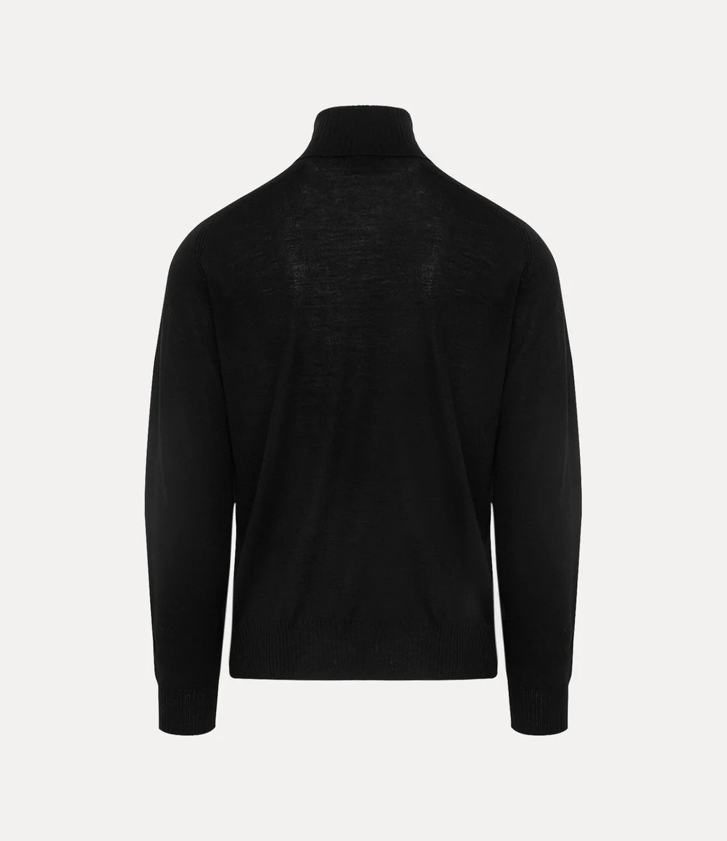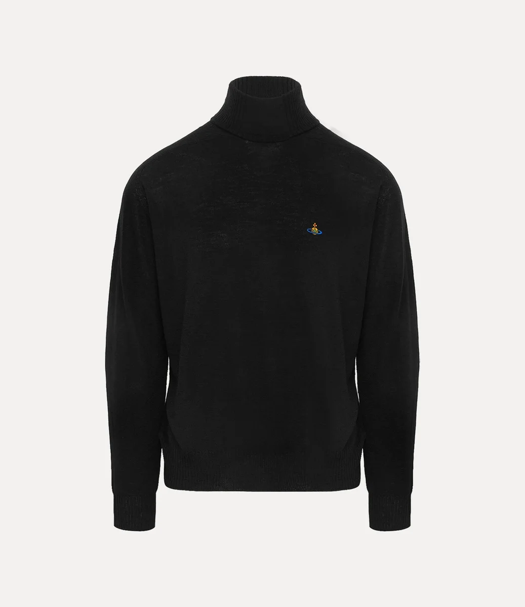 Vår Fisherman Turtleneck är tillverkad av mjuk ull och har en hög ribbad krage som går över i en rak fåll. Den har långa ärmar och ribbade muddar och är prydd med en broderad mångfärgad sfär på vänster sida av bröstet.