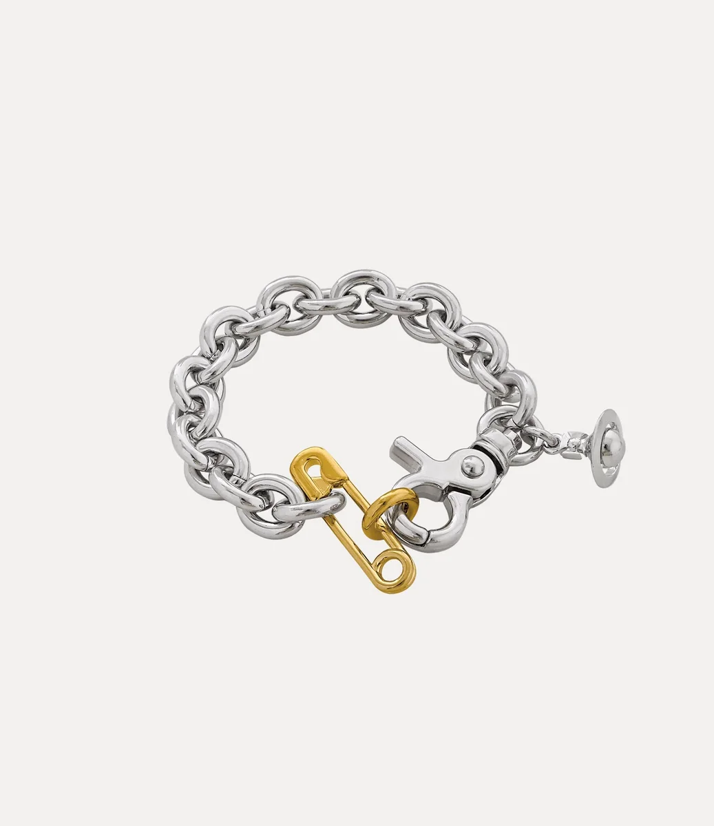 Man. Claude-armbandet, designat med silverfärgad finish, har vår signaturdetalj i form av en säkerhetsnål – en hyllning till Viviennes punkinspirerade, nonkonformistiska stil. En tredimensionell metallorb-berlock hänger från den robusta kabelkedjan och ger smycket en dynamisk touch, medan det hårdvaruinspirerade låset gör det enkelt att stänga.