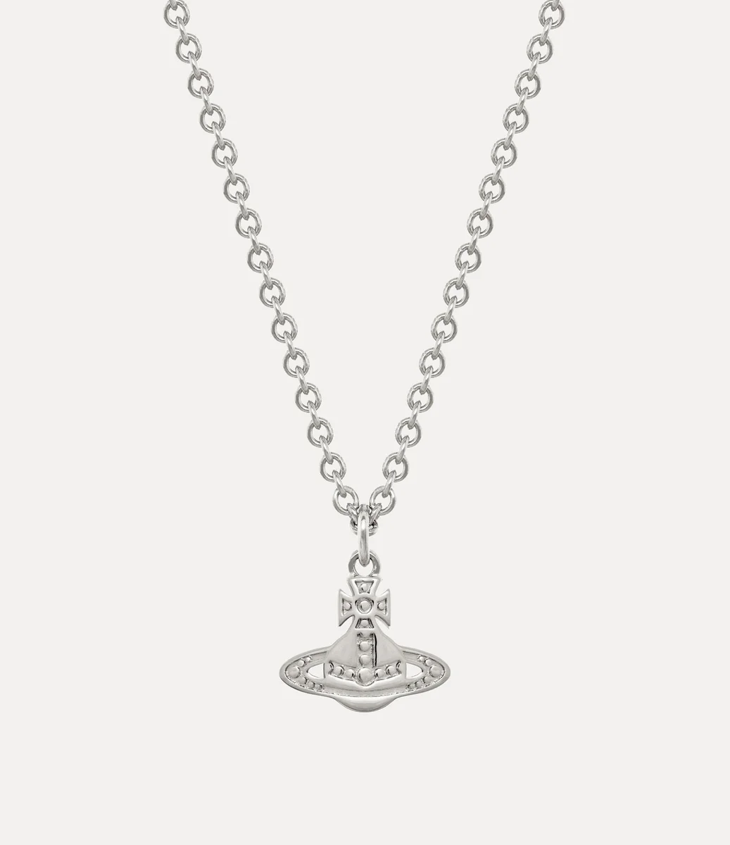 Vårt Man. Marinetta halsband är tillverkat med en silverfärgad yta och har vårt signaturmotiv i form av en sfär, som påminner om Viviennes vision om att föra traditionen in i framtiden. Hänget hänger i en polerad kedja och har en graverad struktur över Saturnusringen, kompletterad med delikata pärlaccenter.