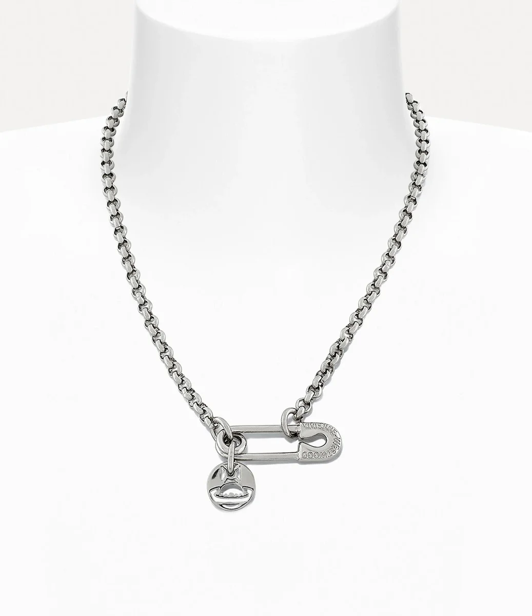 Det silverfärgade halsbandet Man. Imogene har en utskuren sfärplatta som hänger från änden av en graverad säkerhetsnålsberlock. Det är försett med en belcherkedja och ett karbinhake-lås.