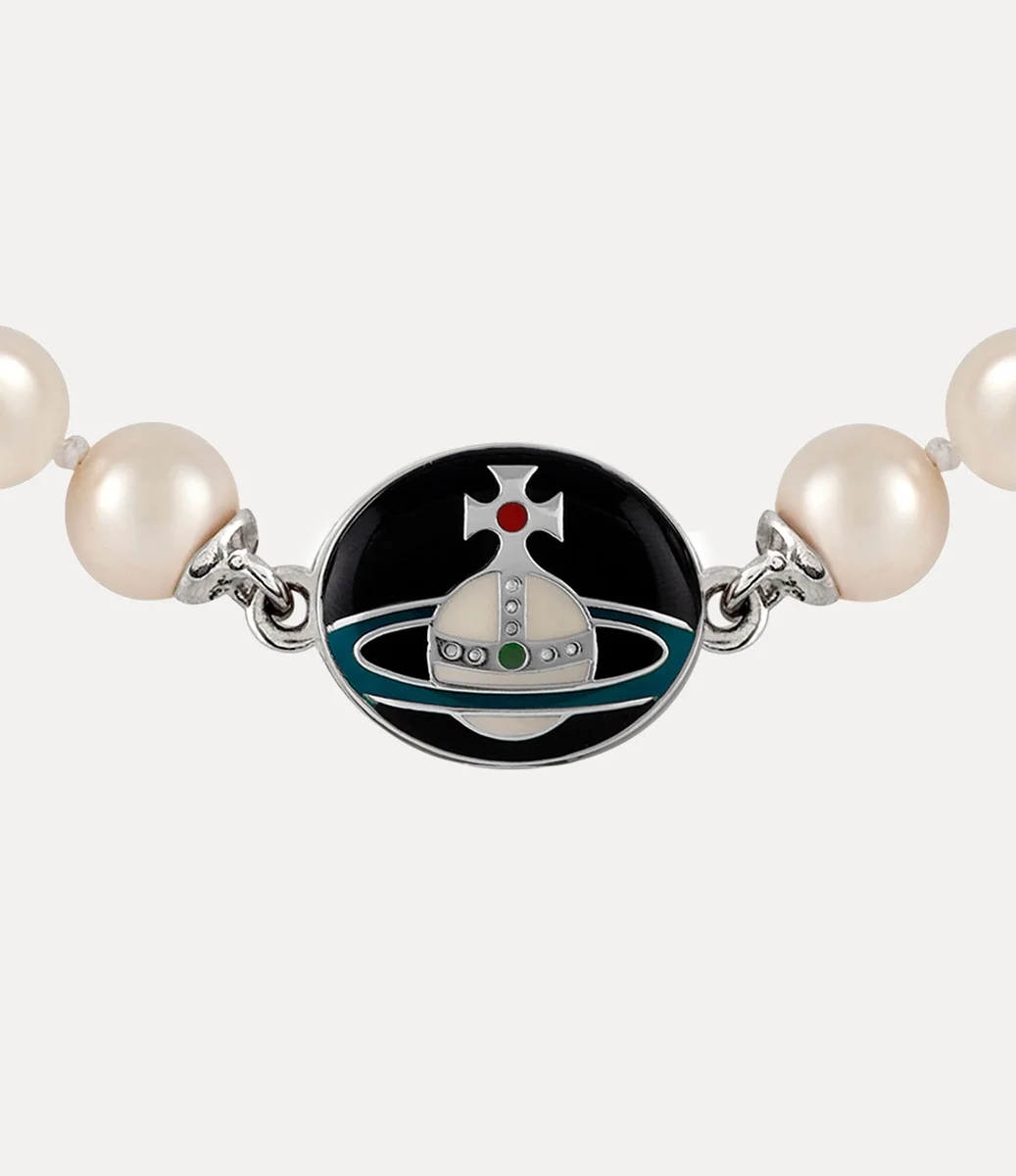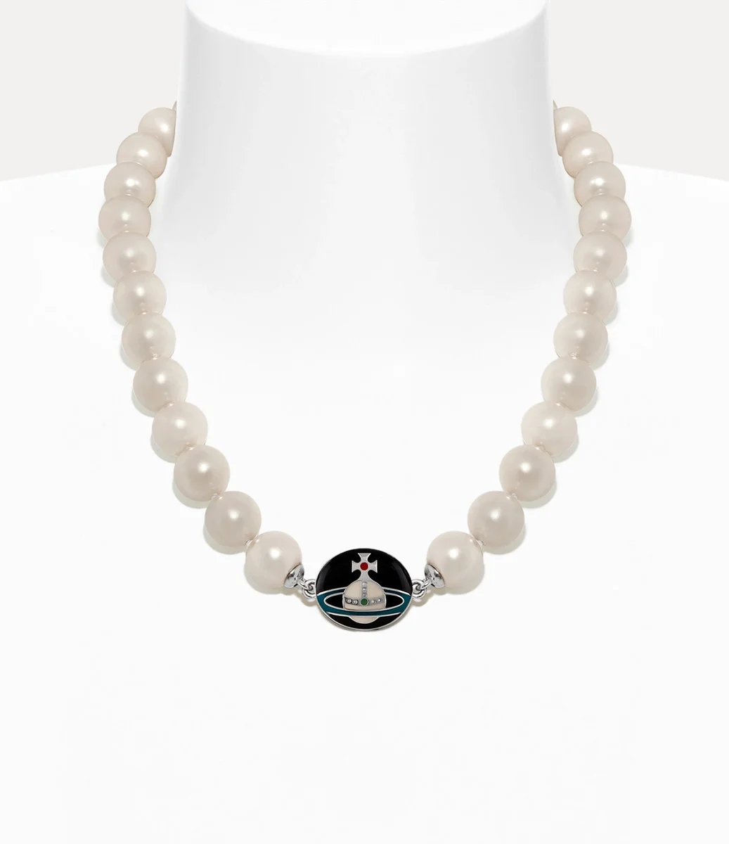 Husets signaturmotiv, sfären, representerar Viviennes vision om att föra traditionen in i framtiden. Vårt Man. Loelia Large Pearl-halsband erbjuder en uppfräschad version av sfären, placerad i mitten av det ovala, knappinspirerade låset, komplett med handmålade emaljdetaljer.
