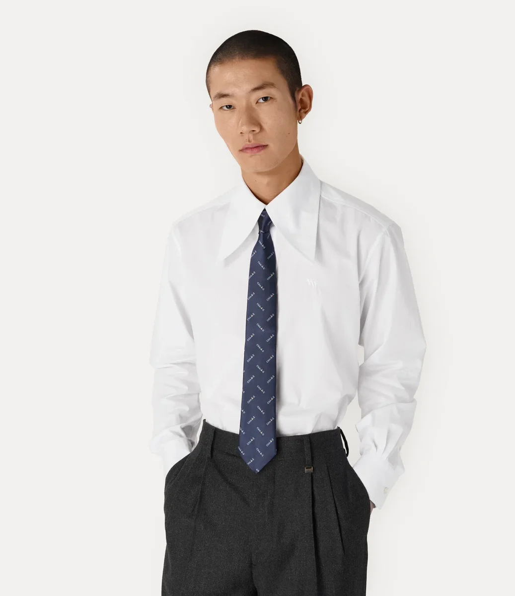 Vår silkeslips har en bred bladform som smalnar av till en klassisk spetsig ände. Designen avslutas med husets signaturmotto ”CHAOS”, som upprepas över hela produkten och fångar Viviennes rebelliska anda och hennes engagemang för att utmana politiska konventioner.