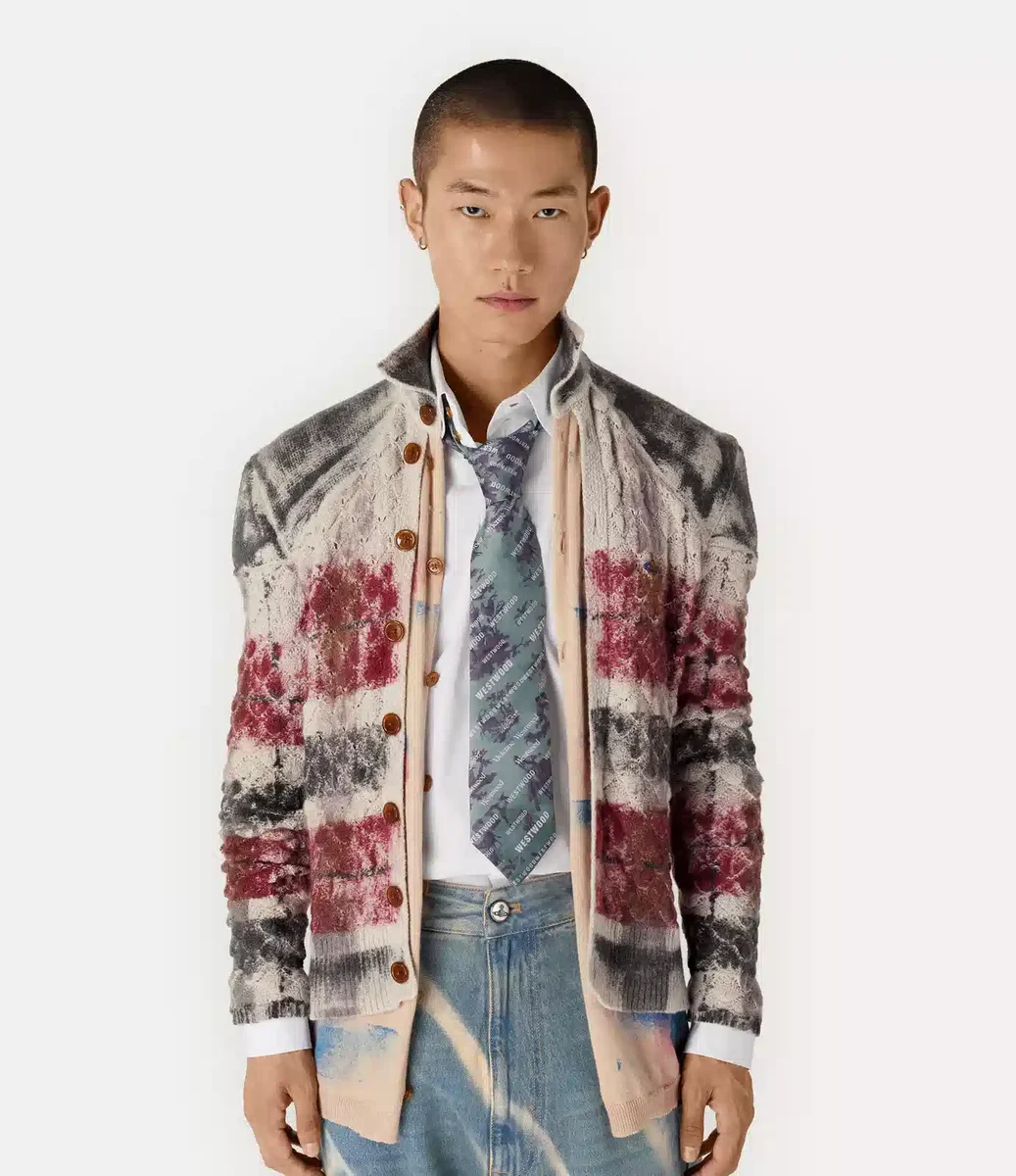 Vår slips har det karakteristiska Toile de Jouy-trycket med ett romantiskt pastoralt motiv över hela designen. Den är skuren med en bred bladform som smalnar av till en klassisk spetsig ände och är avslutad med ett djärvt ”Westwood”-motiv i olika typsnitt som upprepas över hela silhuetten.p>